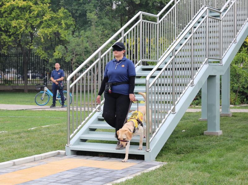 遇到前方有障礙物,導(dǎo)盲犬自覺放慢了速度,用身體的搖擺來提醒主人往哪個方向躲避;聽到“過通道”“找旗桿”的指令,它們能帶領(lǐng)主人順利找到位置……5月19日是第34個全國助殘日,北京農(nóng)學(xué)院、北京市殘聯(lián)在北京市導(dǎo)盲犬培訓(xùn)基地開展導(dǎo)盲犬體驗活動,展示導(dǎo)盲犬工作場景、科普導(dǎo)盲犬相關(guān)知識,讓更多人體驗視障人士使用導(dǎo)盲犬的實際感受,從而在生活中為導(dǎo)盲犬提供工作便利,更好地助力視障人士無障礙出行。