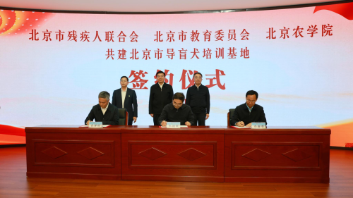 10月31日,北京市殘疾人聯合會、北京市教育委員會、北京農學院共建北京市導盲犬培訓基地簽約儀式在北京農學院舉行。北京市殘疾人聯合會黨組書記、理事長陸曉光,北京市委教育工委委員、市教委副主任張耀天,北京市殘疾人福利基金會理事長侯玉蘭,北京農學院黨委書記趙鋒,黨委副書記、院長段留生出席簽約儀式。
