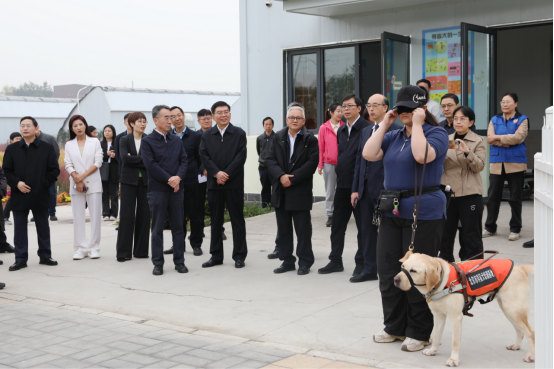 在訓練場,馬駿觀看了導盲犬工作展示,深入了解導盲犬日常養護、訓練,基地建設、運行情況,對學校發揮學科專業優勢推動北京市導盲犬培訓基地建設取得的進展給予充分肯定。