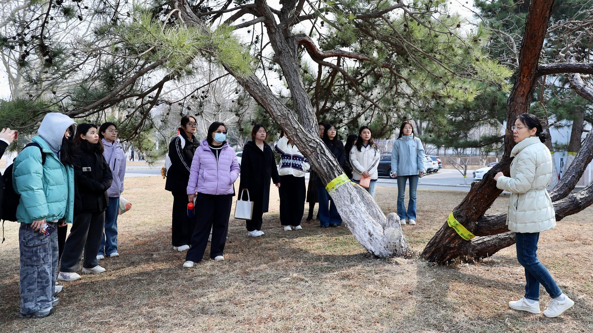 在學校禮堂前,生物與資源環境學院組織了別開生面的“識樹醫木”活動。學校植物健康研究院的趙曉燕教授、任爭光副教授、李遷副教授,帶領同學們漫步校園,逐一“問診”路邊的樹木。在一棵松樹前,老師們停下腳步,輕輕剝開一塊樹皮,向同學們示意:“你們看,這里有蛀干害蟲的痕跡。病蟲害防控的關鍵在于‘早發現、早診斷’。”