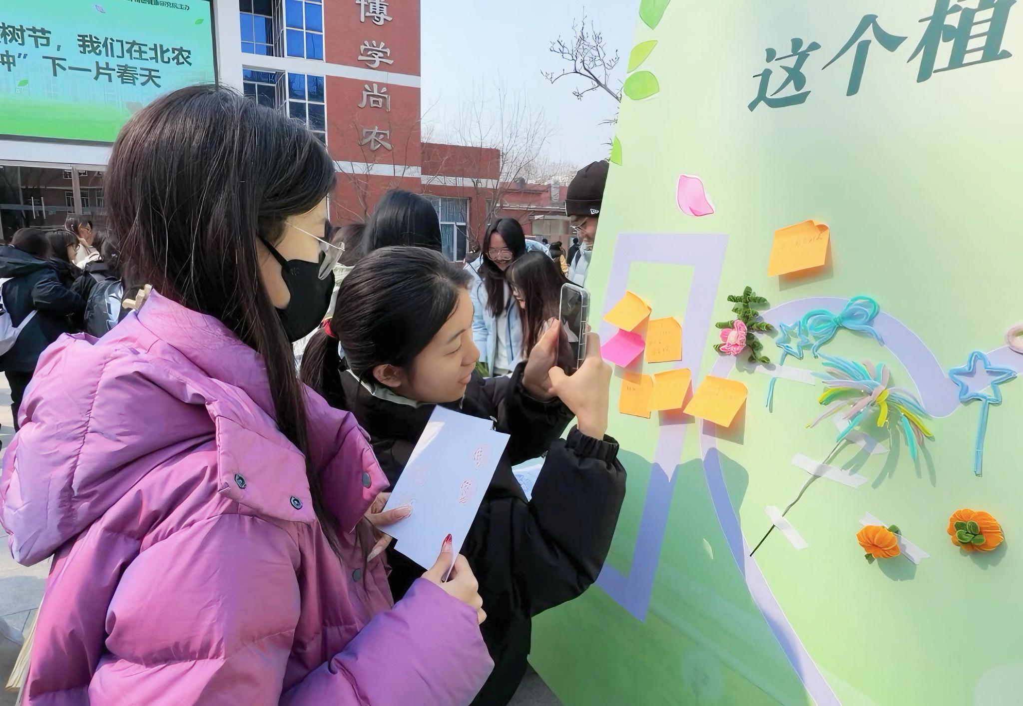 參與活動的同學紛紛寫下對學校的美好祝福、對綠色未來的無限憧憬,有人寫道:“愿北農的每一棵樹都枝繁葉茂,愿我們心中都有一片森林。”有人寫下:“這個植樹節,我們不僅認識了學校的草木,更許下對地球的溫柔承諾。”還有的同學寫道:“今天,既為美麗校園增添新綠;明天,為綠水青山貢獻農科學子力量。”