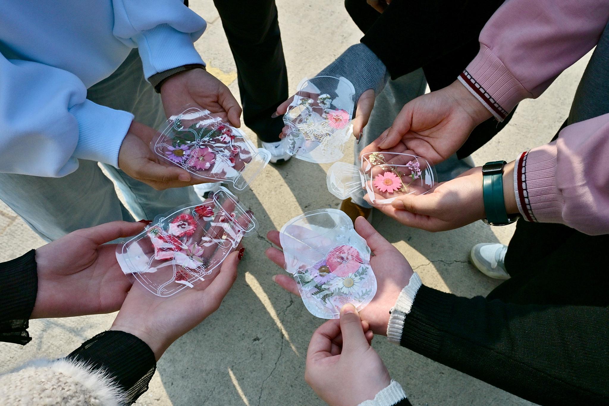 學習完果樹剪枝,同學們體驗起干花書簽創作。師生們將壓好的二月蘭、迎春花花瓣小心翼翼地加入透明書簽中,再用彩筆標注植物名稱和采集地點。“這樣就可以把北農的春天留在書頁里。”大家紛紛舉起剛做好的書簽拍照留念。