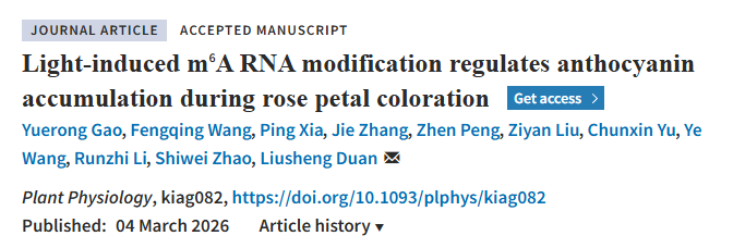 近日,北京農學院段留生教授團隊在國際知名學術期刊Plant Physiology發表題為“Light-induced m?A RNA modification regulates anthocyanin accumulation during rose petal coloration(光誘導m?A RNA修飾調控月季花瓣變色過程中花青苷積累)”的研究論文,首次揭示了光信號通過調控RNA m?A甲基化修飾動態變化,介導光敏感型月季花瓣著色的表觀轉錄調控機制。我校植物科學技術學院高月榮副教授和碩士研究生王鳳清為論文共同第一作者,段留生教授為論文通訊作者。