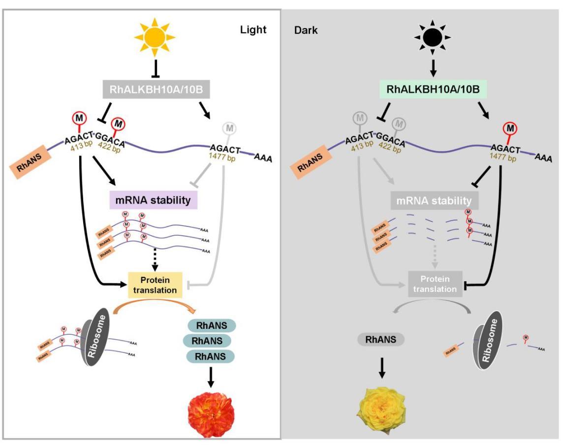 研究以光敏感型月季品種‘Spectra’為材料,系統揭示了光信號通過表觀轉錄調控機制調控月季花瓣著色的新路徑:光抑制去甲基化酶基因RhALKBH10A/10B的表達,進而調控花青素合成關鍵基因RhANS的m?A修飾模式——促進CDS m?A修飾以增強mRNA穩定性與翻譯效率,同時降低3'UTR區的m?A修飾水平解除其抑制效應,二者協同提升RhANS的mRNA穩定性和翻譯效率,最終驅動花青素積累。該研究不僅首次在植物光誘導器官著色過程中揭示m?A修飾功能的位置依賴性,也為理解光信號調控植物器官著色的m?A表觀轉錄組修飾機制提供了新視角,為改良花卉色澤及作物品質提供了潛在分子靶點。