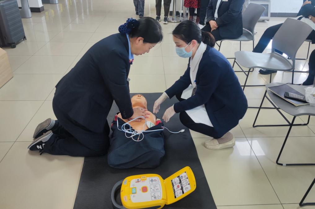培訓現場,醫護人員圍繞 CPR、除顫儀、紫外線燈使用及消毒液配比等內容展開詳細講解。其中,自動體外除顫器(AED)作為心臟急救的 “救命神器”,成為此次培訓的重中之重。醫護人員通過規范、細致的現場演示,對 AED 設備快速開啟、電極片正確粘貼、嚴格遵循語音提示操作等全流程進行標準示范。參與培訓的保潔值班人員紛紛上前實操演練,在醫護人員的指導下,逐步掌握了 AED 的使用要點。