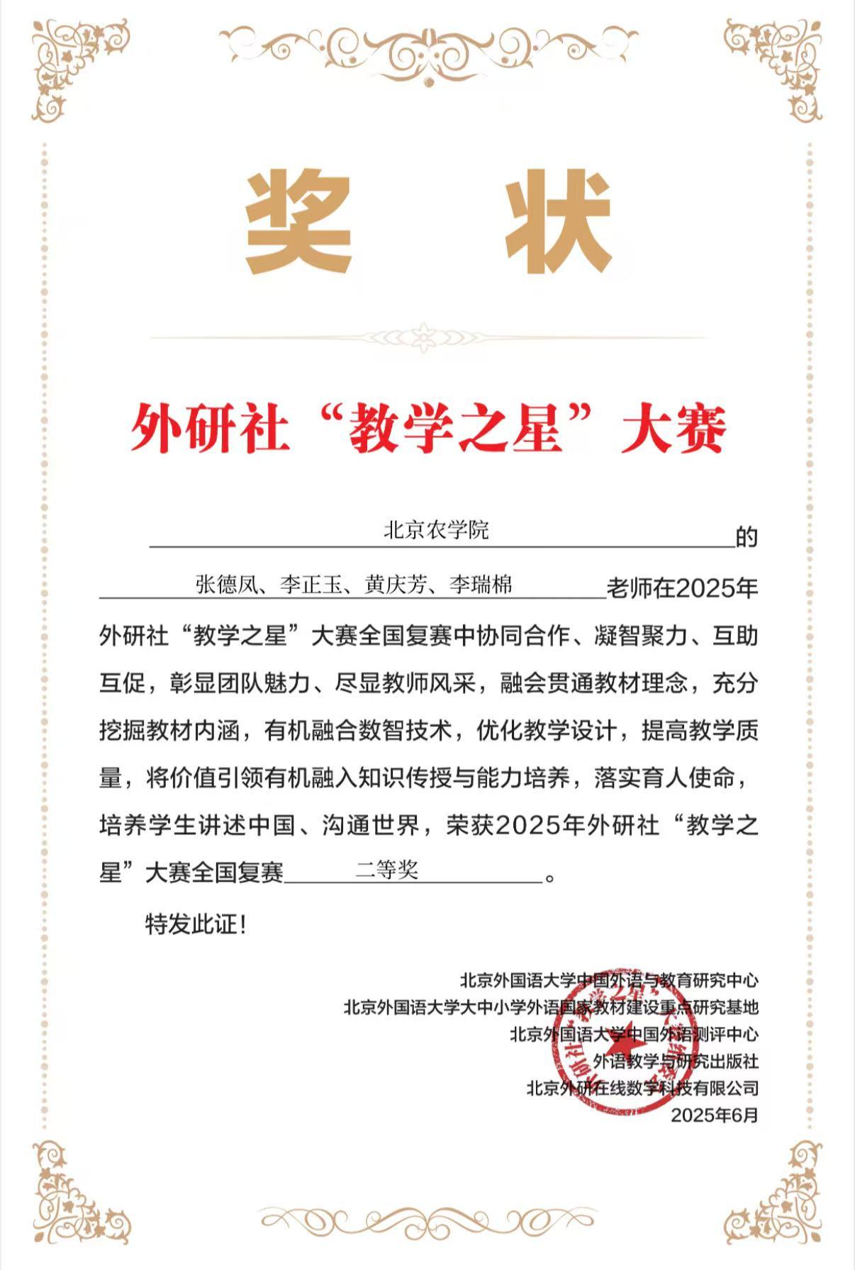 近日,由北京外國語大學中國外語與教育研究中心、北京外國語大學中國外語教材研究中心、北京外國語大學中國外語測評中心和外語教學與研究出版社共同舉辦的2025年外研社“教學之星”大賽全國復賽落下帷幕,由我校張德鳳、李正玉、黃慶芳、李瑞棉老師組成的教師團隊通力合作,榮獲全國復賽二等獎。
