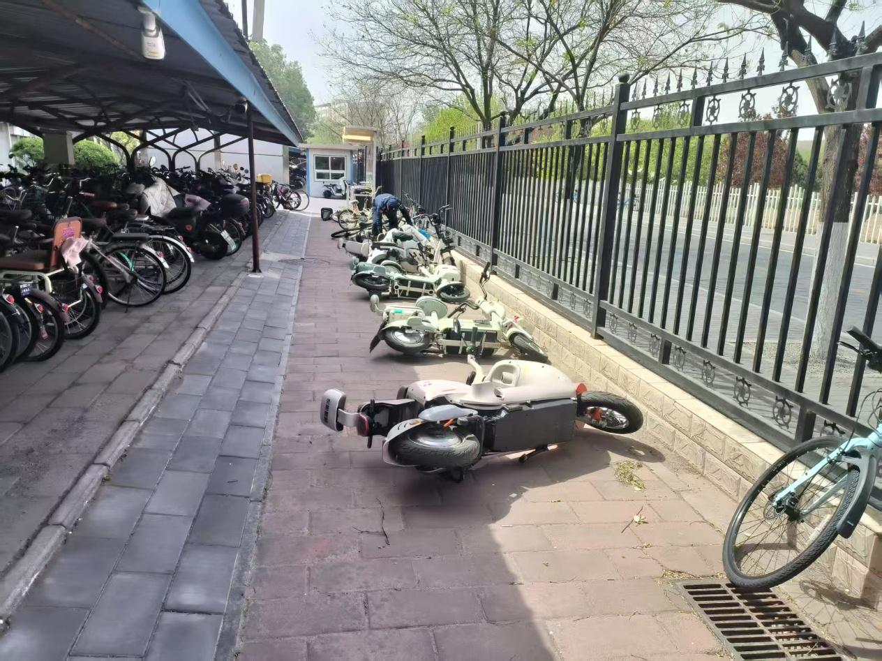 為確保師生安全,安穩(wěn)處對校園內(nèi)的危險區(qū)域用警戒線進行了警戒,防止人員進入可能受大風影響的區(qū)域;對校園內(nèi)已經(jīng)斷電的充電樁進行安全檢查,確保其在大風天氣下處于安全狀態(tài);為防止大風天氣導致電動車傾倒造成損壞,提前將校園內(nèi)電動車放倒,確保車輛安全。