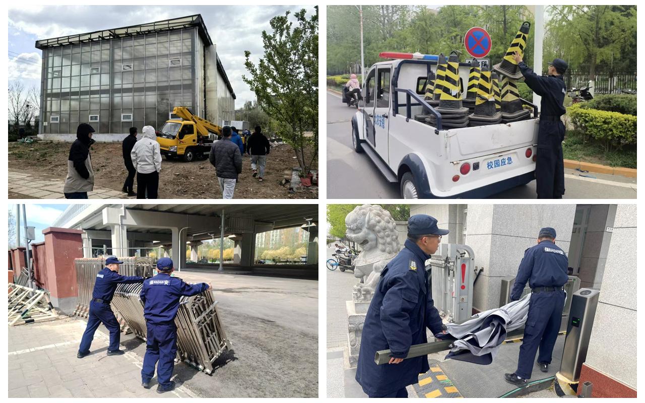安穩(wěn)處組織人員對校園內(nèi)的玻璃溫室進行了加固,確保在大風天氣下溫室結(jié)構(gòu)的穩(wěn)固性,防止玻璃破損或結(jié)構(gòu)倒塌;對校園內(nèi)易損壞的設備進行了暫時收納,包括錐桶、電動伸縮門、遮陽傘等,將其放置在安全地點,防止被大風吹倒或損壞。