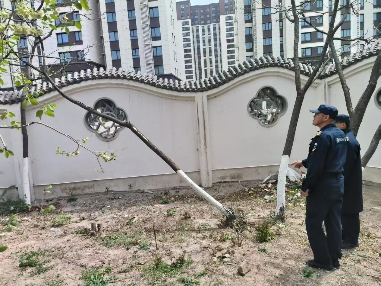 大風過后,保安人員對校園內(nèi)被刮倒的樹木進行了記錄和清理,確保校園道路暢通,減少安全隱患。