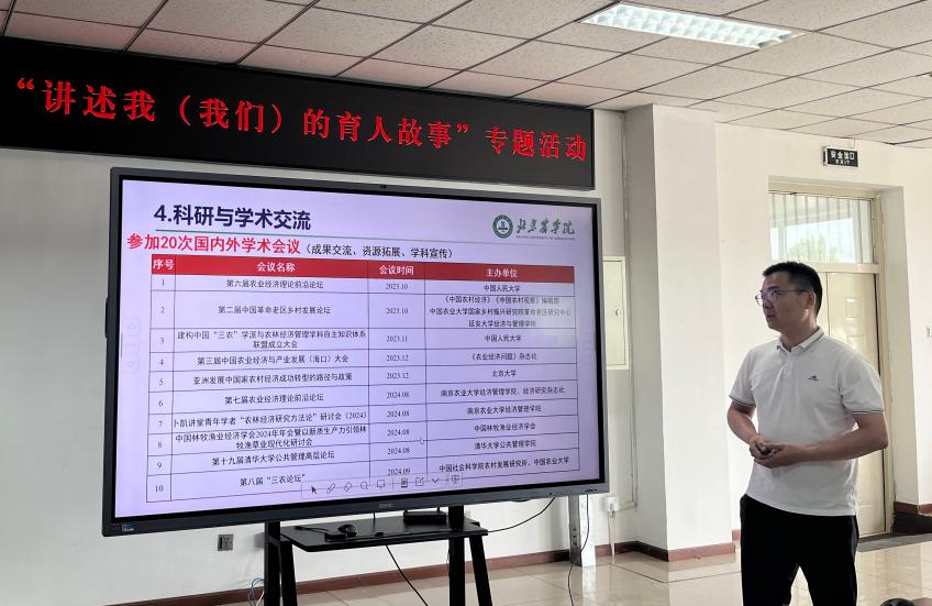 會上,農林經濟管理系教師張強強圍繞近期他作為論文第一作者,何忠偉教授為通訊作者在國際知名期刊《Sustainable Cities and Society》發表高水平學術論文的經歷,結合自身參與學科建設、開展科學研究、做好學生班級管理及個人發展等內容,分享了自己的育人故事。他以“科研”為支點,講述了十年來科研如何支撐個人發展、助力個人成長的心路歷程,并從科研與班級建設、日常工作、學科建設、學術交流、個人發展等方面展開專題講述。他分享道:“科研育人要做到‘八要’——要健康、要學習、要合作、要生活、要堅持、要熱愛、要分享、要尊重。”這番真誠的經驗分享引發了在場教師的共鳴。