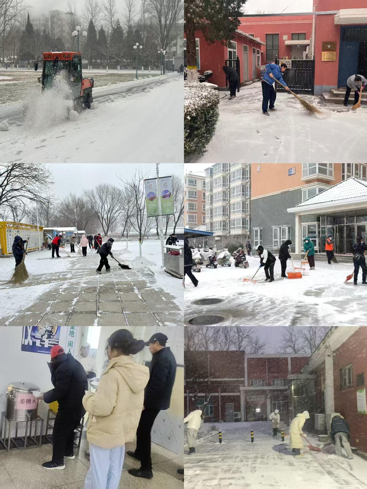 寒風中的堅守,是最暖的風景。機械組駕駛設備反復清掃主干道及停車場,人工組手持工具清理臺階、坡道等機械作業盲區,維修組同步排查校舍屋頂、樹木枝干積雪隱患,保潔組在樓宇入口鋪設防滑墊、擺放“小心地滑”警示標識。供暖組24小時值守,保障室內溫度穩定,食堂團隊提前到崗,備好暖暖的姜糖水,確保熱餐熱飲準時供應。冰雪覆蓋的路面,汗水凝結成眉梢的冰霜,卻擋不住大家“搶時間、保安全”的干勁。