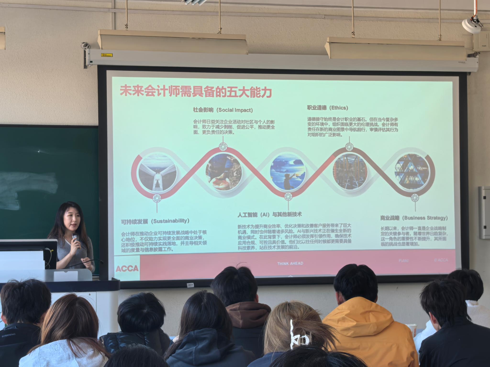 近日,ACCA(特許公認會計師公會)北京代表處范玉涵老師來到經濟管理學院,走進會計學(ACCA方向)實驗班,開展專題宣講,為同學們全面解讀未來ACCA專業資格、關鍵節點與支持時間表、學習支持資源,以及ACCA全國就業力X未來商業創想大賽相關信息,助力學子精準把握考綱變革,科學規劃學習與職業發展路徑。