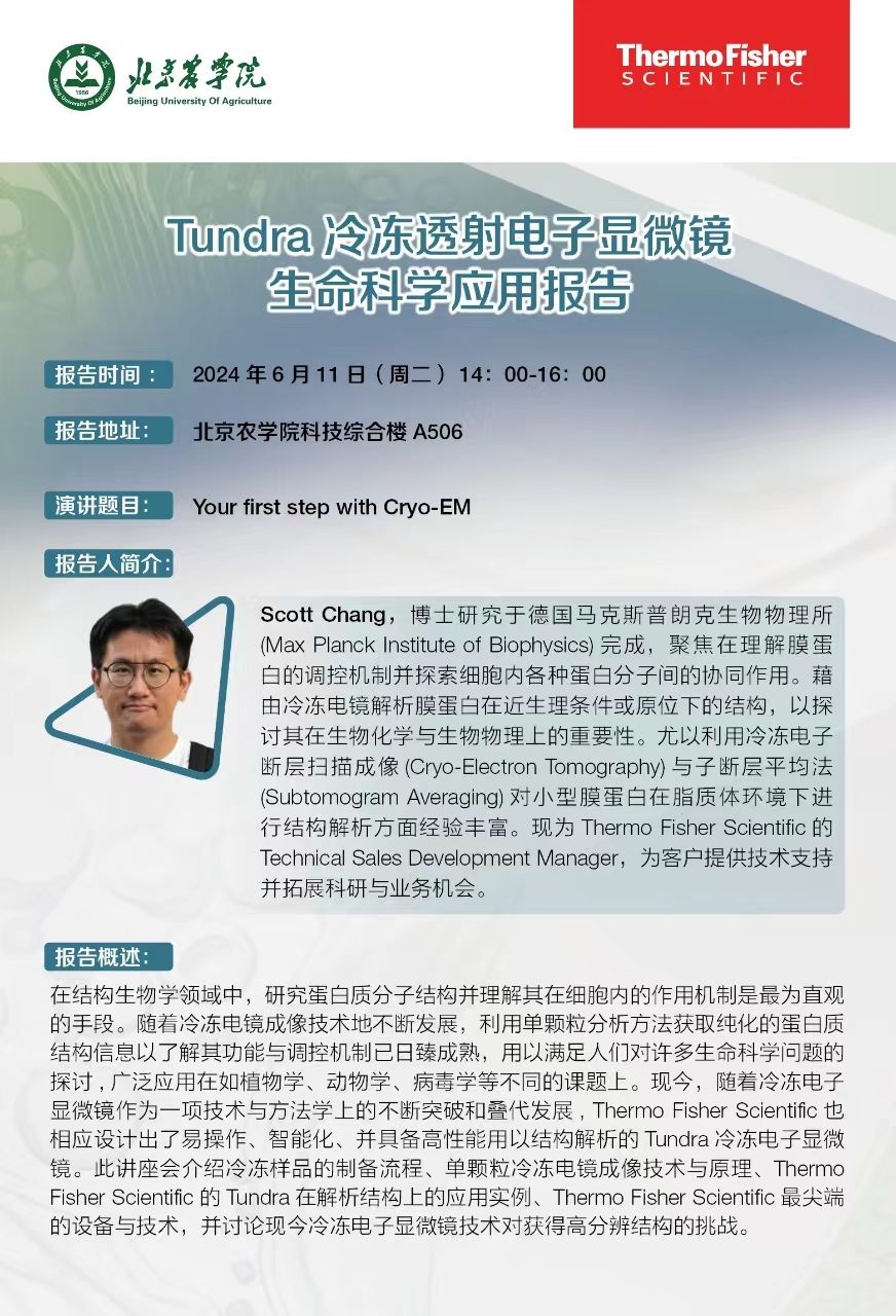 在結構生物學領域中,研究蛋白質分子結構并理解其在細胞內的作用機制是最為直觀的手段。隨著冷凍電鏡成像技術地不斷發展,利用單顆粒分析方法獲取純化的蛋白質結構信息以了解其功能與調控機制已日臻成熟,用以滿足人們對許多生命科學問題的探討,廣泛應用在如植物學、動物學、病毒學等不同的課題上。現今,隨著冷凍電子顯微鏡作為一項技術與方法學上的不斷突破和疊代發展, Thermo Fisher Scientific也相應設計出了易操作、智能化、并具備高性能用以結構解析的Tundra冷凍電子顯微鏡。此講座會介紹冷凍樣品的制備流程、單顆粒冷凍電鏡成像技術與原理、Thermo Fisher Scientific的Tundra在解析結構上的應用實例、Thermo Fisher Scientific最尖端的設備與技術,并討論現今冷凍電子顯微鏡技術對獲得高分辨結構的挑戰。