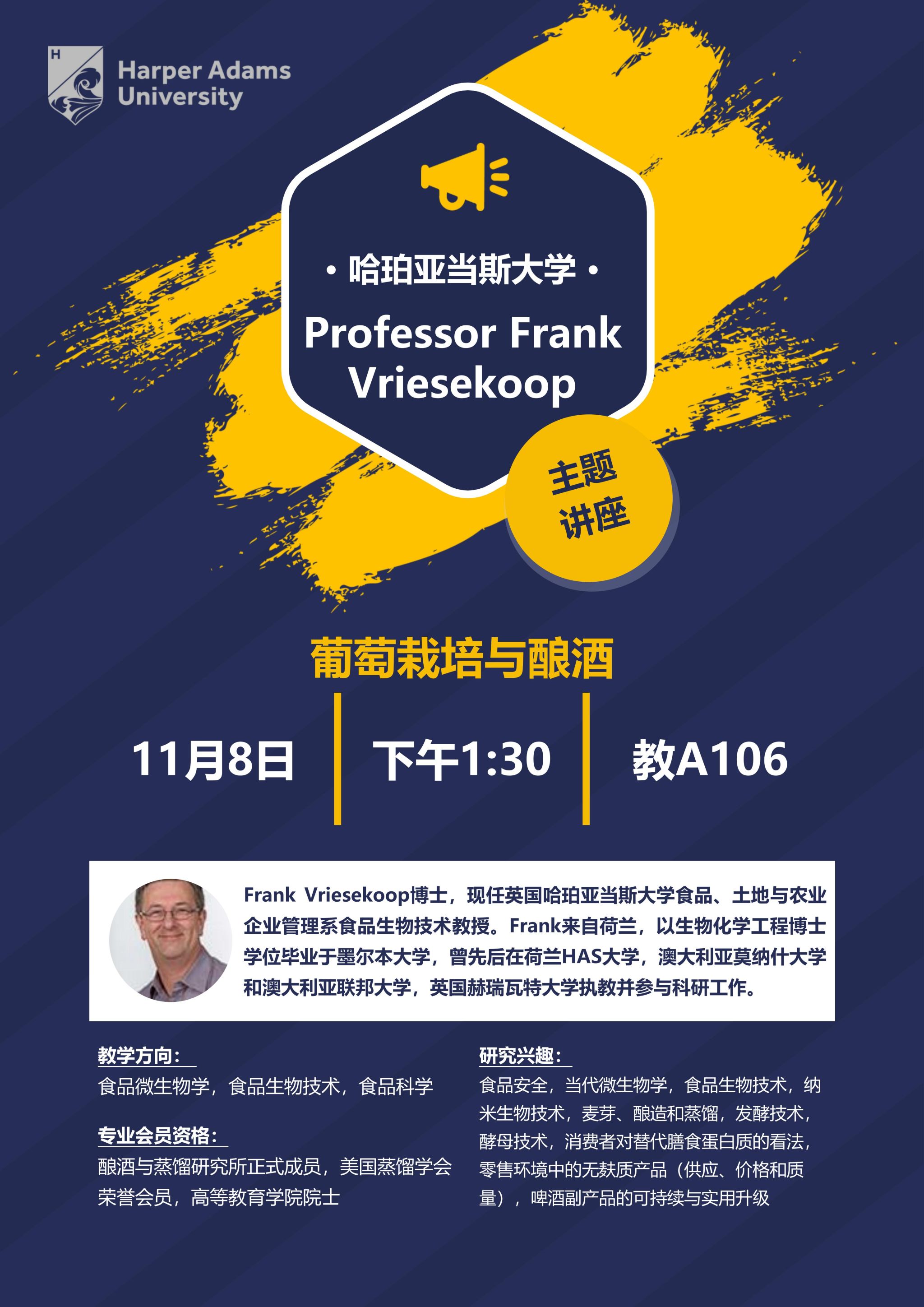 英國哈珀亞當斯大學Frank Vriesekoop教授應邀擬于11月8日來訪我校,來訪期間擬做相關專業(yè)領域的學術報告,具體安排如下: