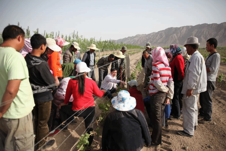 在完成教學(xué)與科研工作之余,李德美用大量時(shí)間開(kāi)展社會(huì)服務(wù)工作,他常年扎根新疆、寧夏及河北等地的葡萄園里開(kāi)展現(xiàn)場(chǎng)技術(shù)指導(dǎo)和培訓(xùn)。他在新疆焉耆培訓(xùn)當(dāng)?shù)丶夹g(shù)人員并支持焉耆在戈壁荒灘種植10萬(wàn)畝釀酒葡萄,建成國(guó)家級(jí)釀酒葡萄栽培標(biāo)準(zhǔn)示范區(qū),新增就業(yè)2000余人,為脫貧攻堅(jiān)做出了重要貢獻(xiàn)。