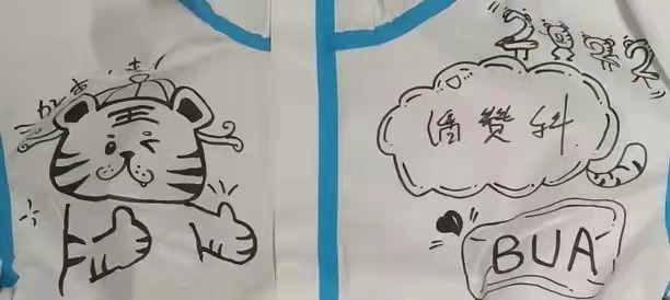 愛畫畫的王鎮(zhèn)韜還和小伙伴們一起在防護(hù)服上進(jìn)行繪畫創(chuàng)作。“在防護(hù)服上寫名字時(shí),我就想,我可以在防護(hù)服上進(jìn)行簡(jiǎn)單的繪畫創(chuàng)作,從而展示冬奧精神和大學(xué)生志愿者的形象啊!”