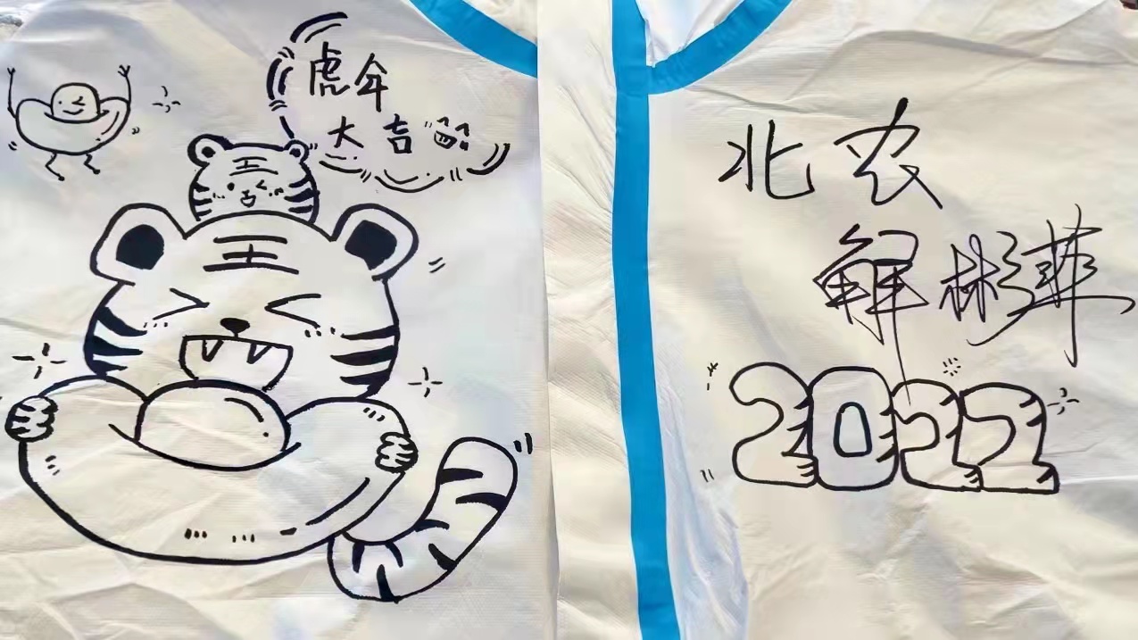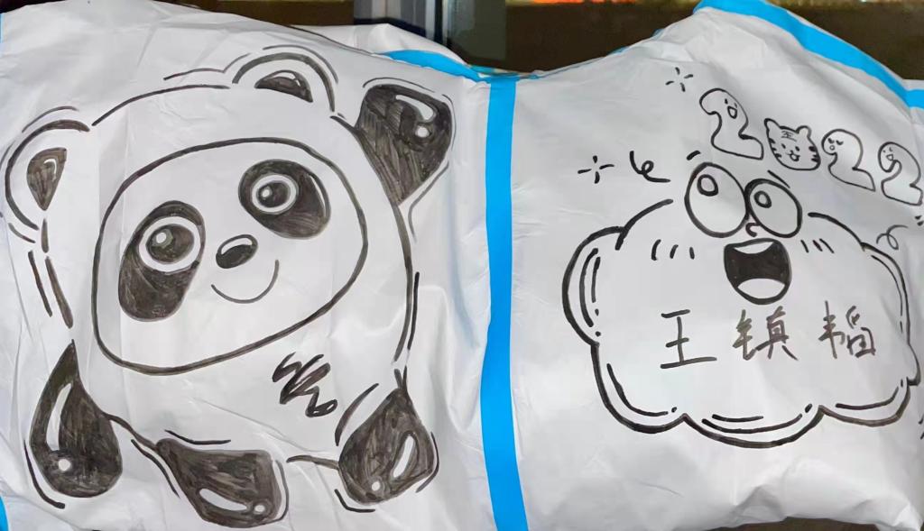 這一想法得到批準(zhǔn)后,他和同組的小伙伴解彬菲、潘贊科開始了在防護(hù)服上作畫的創(chuàng)作之旅。“每次上崗前,我們都會(huì)提前畫好防護(hù)服上的圖案。”他們并不是隨意創(chuàng)作,“經(jīng)過討論,我們一致認(rèn)為,繪畫要突出中國(guó)傳統(tǒng)文化和冬奧元素。當(dāng)然,我們每次繪畫時(shí)都仔細(xì)檢查防護(hù)服的密閉性,確保使用安全。”