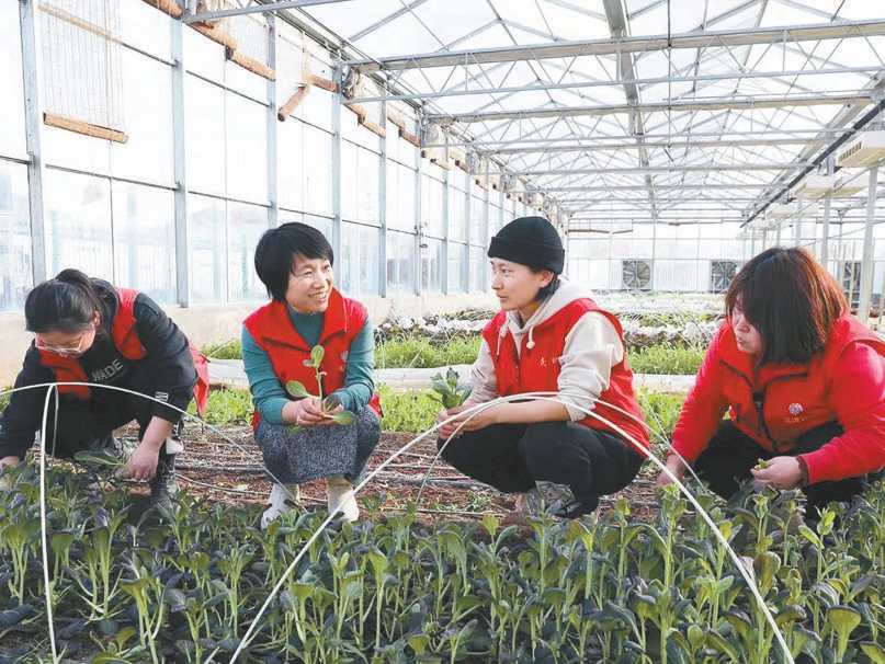 順義區龍灣“巧嫂”張亞利(左二)和工作人員打理育苗室 侯欣澤攝
