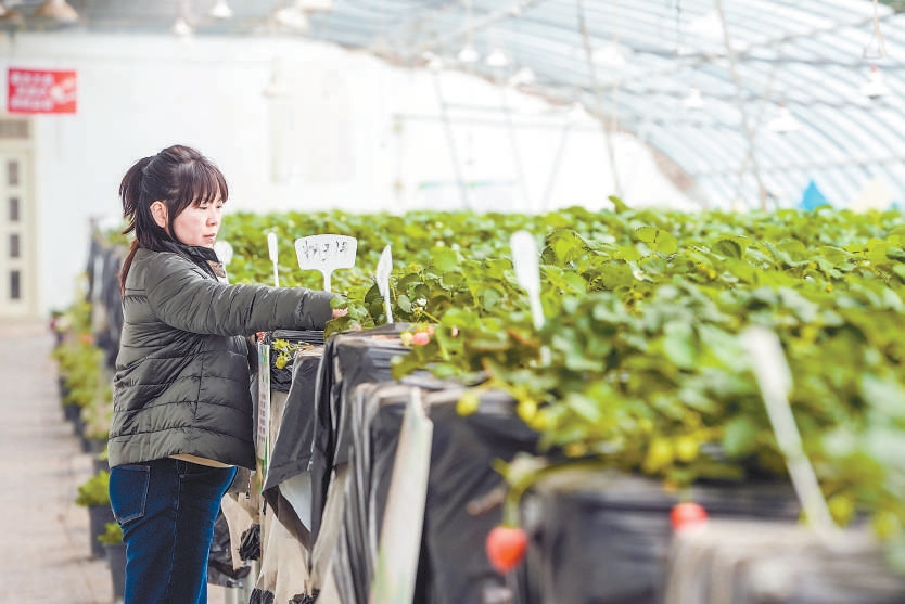 在她的大棚里,匯聚了30多種草莓新品種,包括北京市農林科學院培育的京泉香、白雪公主、香杉等,杭州市農科院培育的粉玉,寧波市農科院的夢之瑩,貴州省園藝研究所選育的黔莓1號等,還有韓國來的圣誕紅、日本來的黑珍珠……不僅品種不斷上新,夏秋桐還嘗試了立體高架式種植,高度從一層到四層不等,好采摘又好看。去年,棚里建立了直播基地,通過互聯網平臺進行草莓銷售,貨賣得不錯,還留住了2萬多名“鐵粉”。目前合作社的成員一共60多戶,遍布崔村、興壽、小湯山、百善4個草莓主產鎮,合作社成員中也多了不少年輕的面孔。