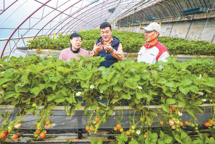 “頭雁”崔天鋆(中)與農戶討論草莓種植 本報記者 武亦彬攝