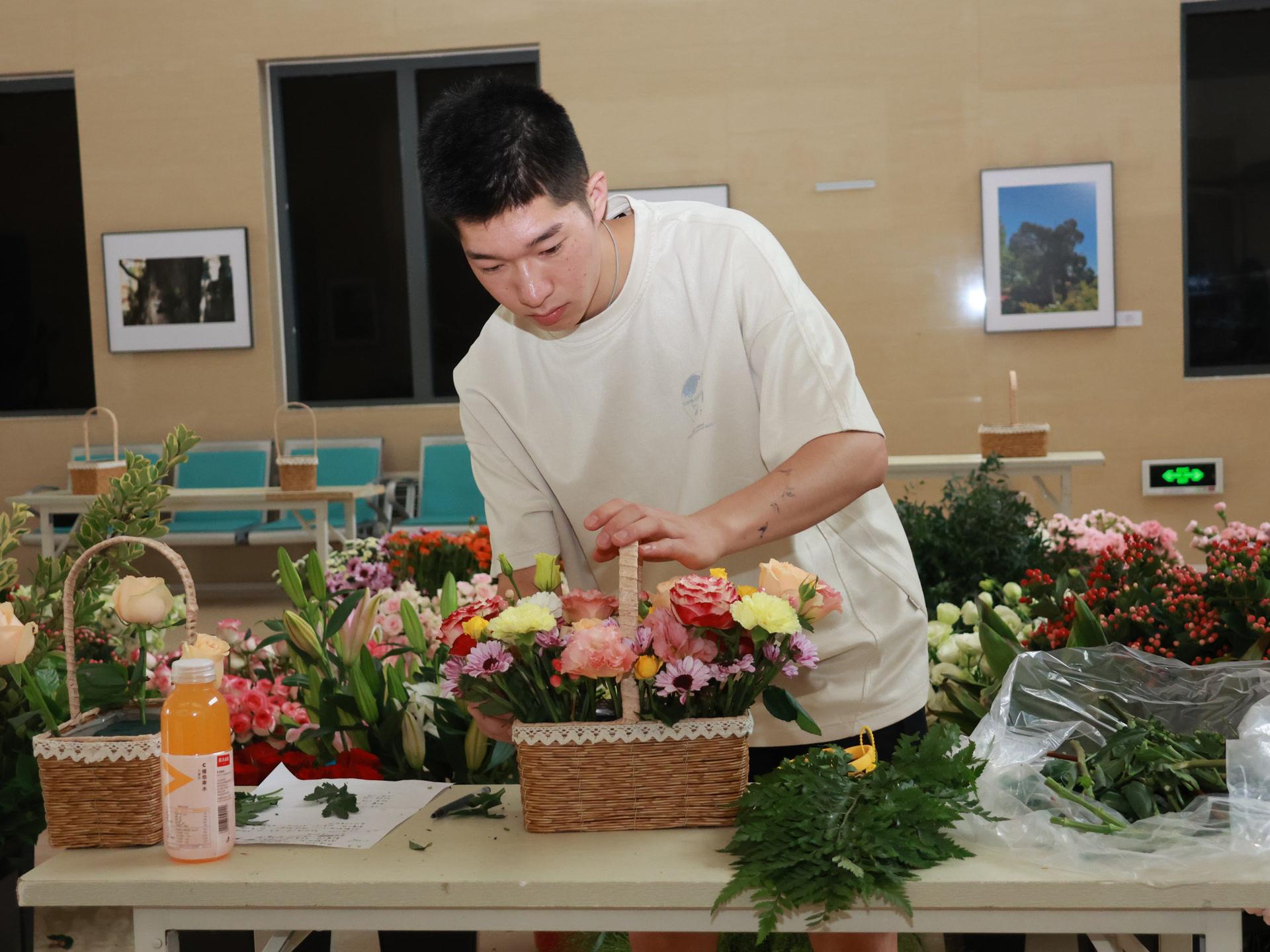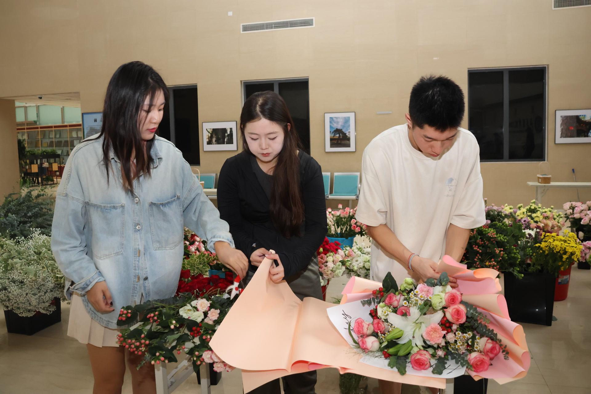 在侯芳梅的指導(dǎo)下,學(xué)生們挑選寓意美好的康乃馨、滿天星、玫瑰、百合等花卉,制作花籃和花束。“這是一次難忘的專業(yè)實踐活動,我運(yùn)用在插花藝術(shù)課堂上學(xué)到的色彩等知識與技巧,制作了十幾束花,表達(dá)我對老師們的感謝。祝老師節(jié)日快樂、幸福安康。”一位參與活動的學(xué)生說。