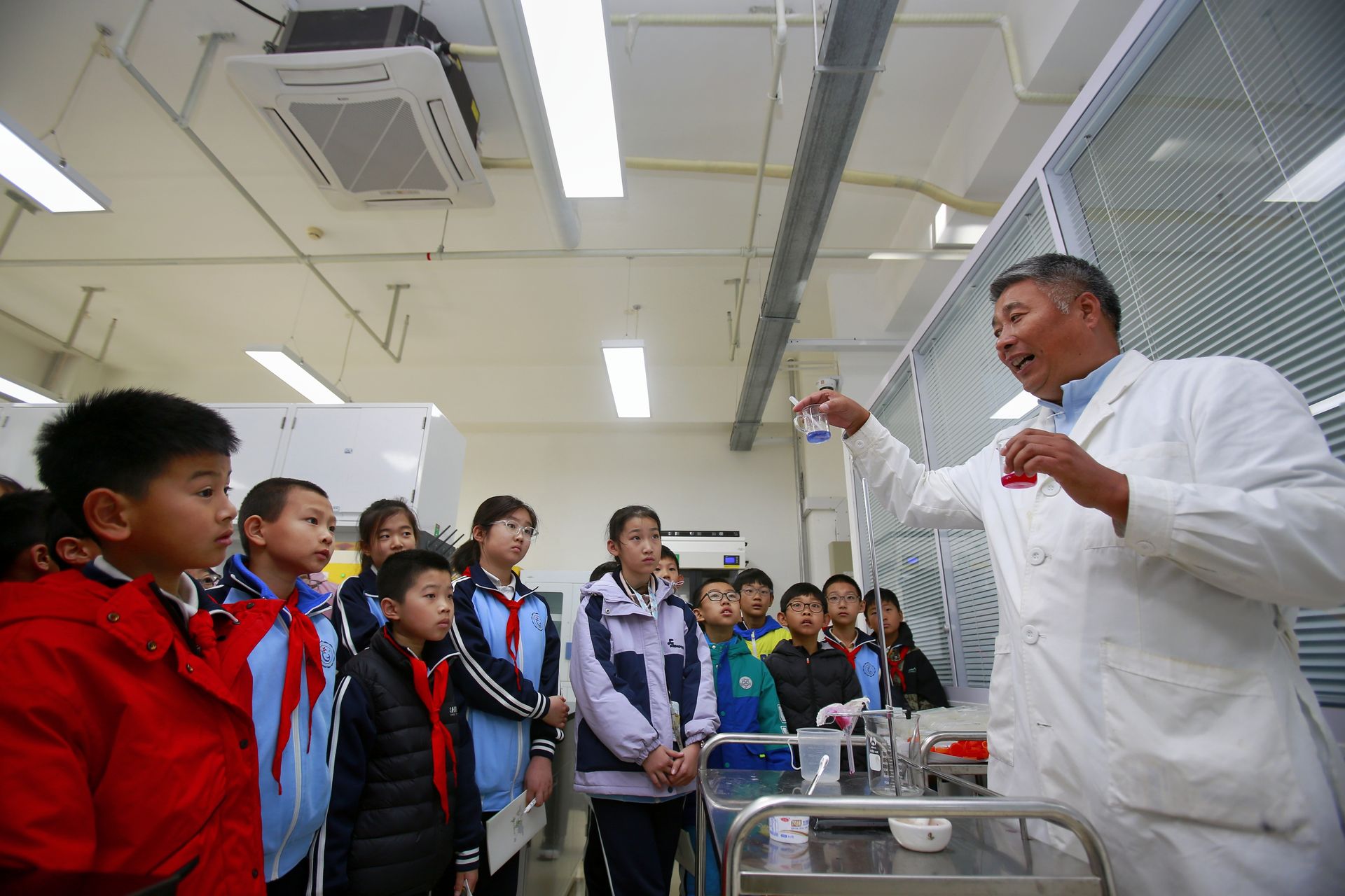 在北京農學院國家大學科技園的實驗室里,“色彩魔術師”課程熱鬧開課。高級實驗師王建立帶領學生用紫甘藍榨汁提取花色苷,當白醋加入后汁液變紅,小蘇打水倒入后轉為藍色,現場響起陣陣驚呼。“我們選花色苷做實驗,既因為深秋紅葉里富含這種物質,貼近生活,又用了白醋、蘇打等安全試劑,保障學生安全。”王建立介紹,針對小學生特點,實驗聚焦基礎觀察。“花青素遇酸變紅、遇堿變綠,太有意思了!”學校六年級(1)班學生黃思思盯著變色的汁液感覺非常神奇。她在體驗后明確了職業方向:“小時候就對植物感興趣,今天看到科技與農業的融合,我以后想從事農業相關工作。”