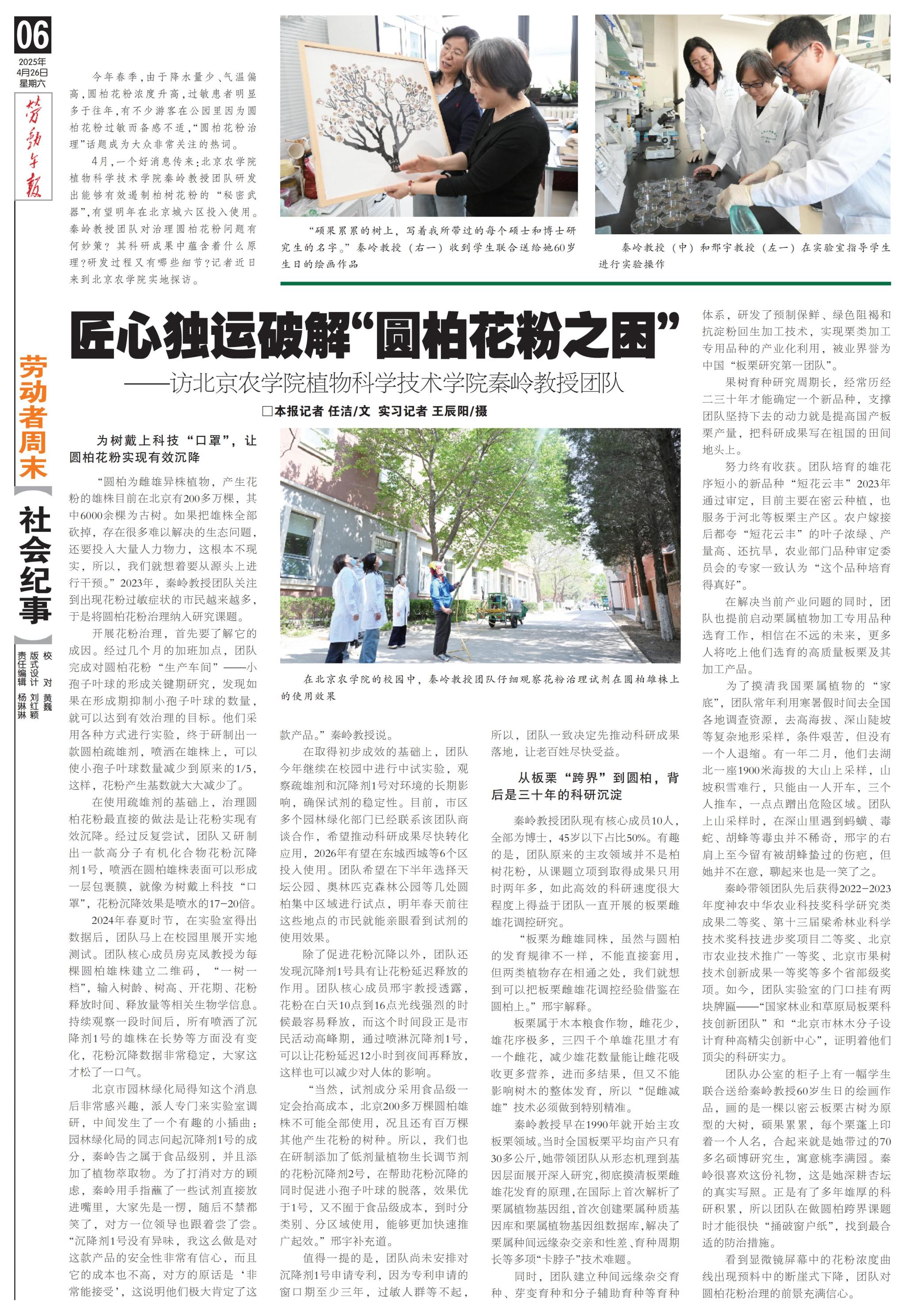 在北京農(nóng)學(xué)院的校園中,秦嶺教授團隊仔細觀察花粉治理試劑在圓柏雄株上的使用效果