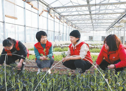 順義區龍灣“巧嫂”張亞利(左二)和工作人員打理育苗室 侯欣澤攝