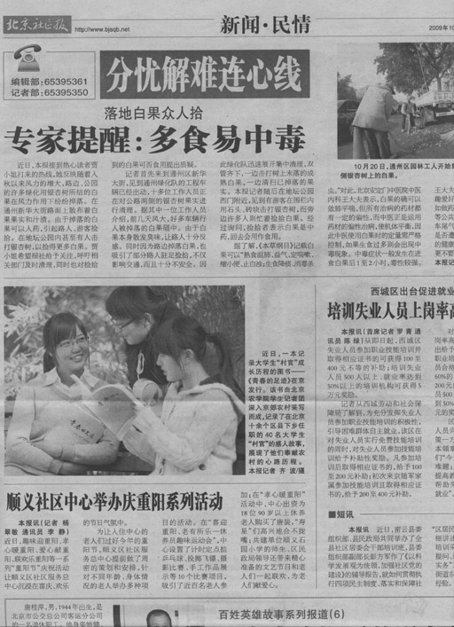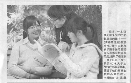 近日,一本記錄大學(xué)生“村官”成長歷程的圖書——《青春的足跡》在京發(fā)行。該書由北京農(nóng)學(xué)院學(xué)生記者團深入京郊農(nóng)村采寫而成,記錄了在北京十余個區(qū)縣下鄉(xiāng)任職的40名大學(xué)生“村官”的感人故事,展現(xiàn)了他們奉獻農(nóng)村的心路歷程。