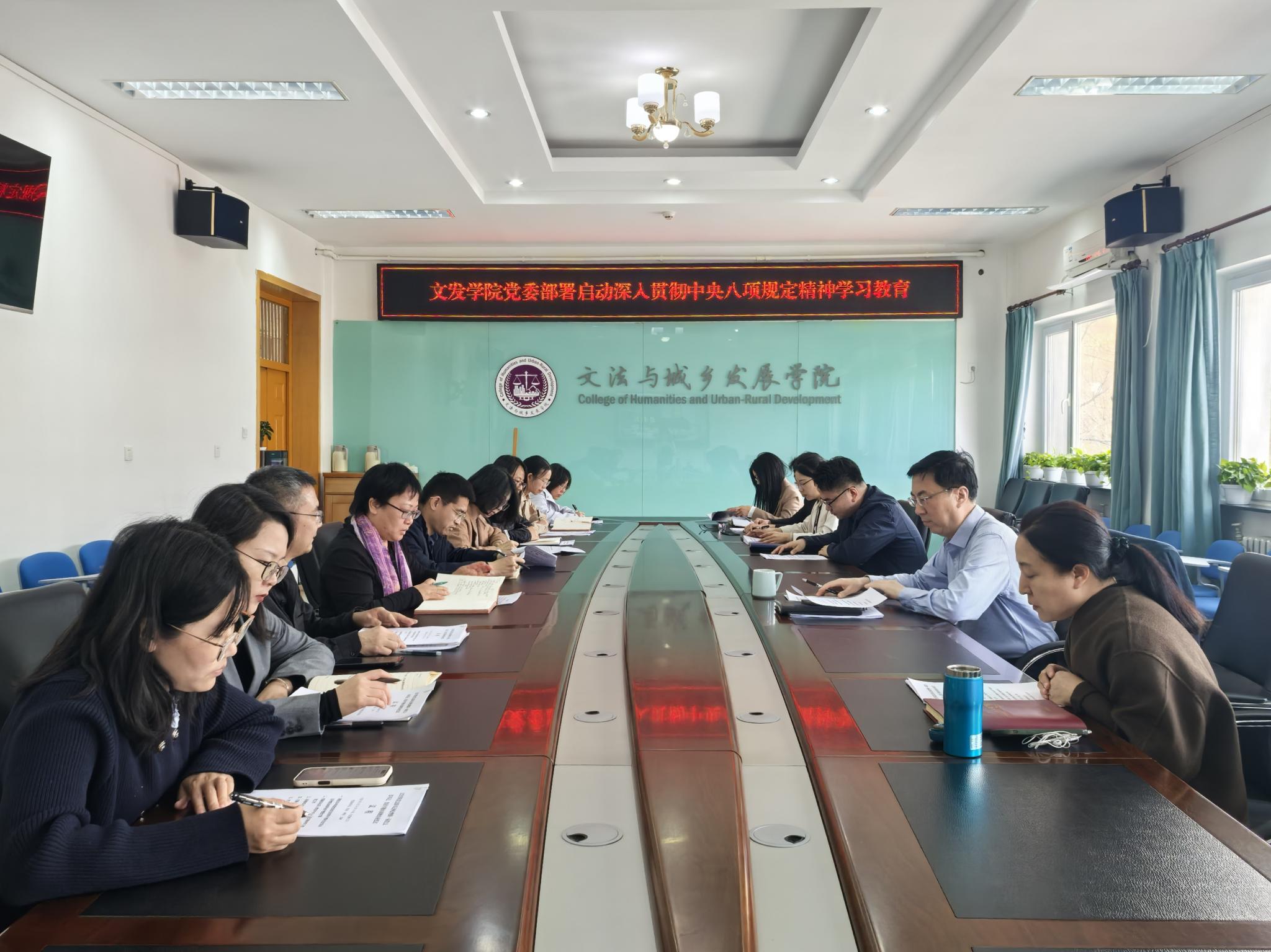 3月24日,文法與城鄉發展學院黨委召開黨支部書記例會,傳達學習中共中央辦公廳《關于在全黨開展深入貫徹中央八項規定精神學習教育的通知》和學校黨委黨的建設工作領導小組(擴大)會議精神,部署啟動深入貫徹中央八項規定精神學習教育工作。會議由學院黨委書記趙和文主持。