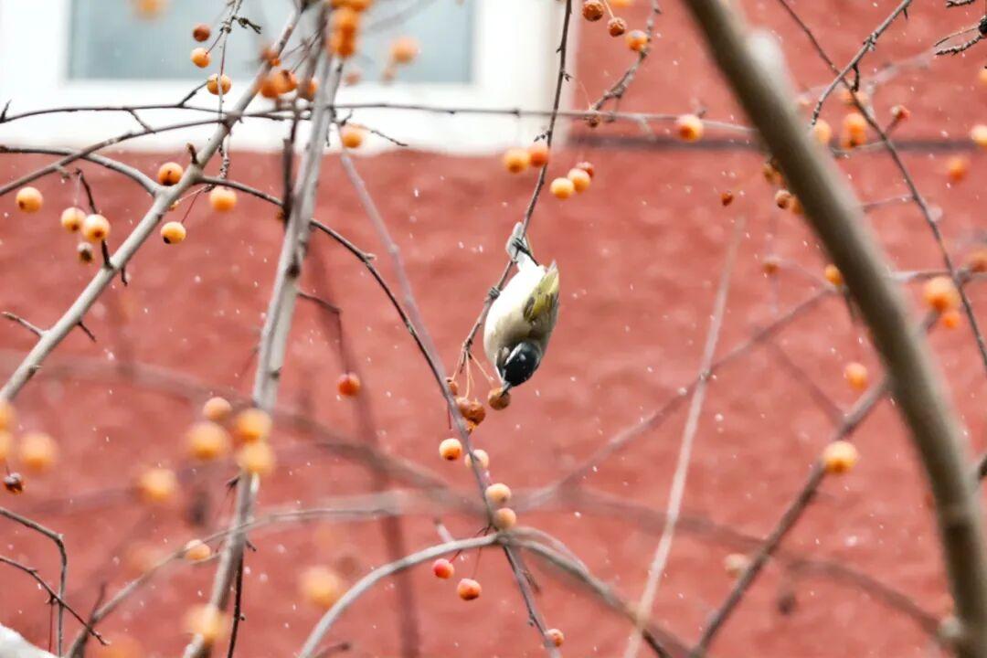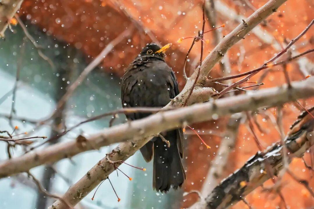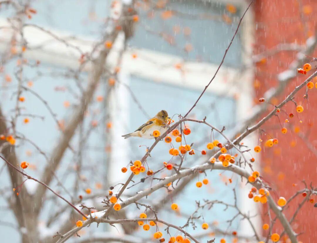 傍晚時分瑩白的羽絮已覆滿枝頭