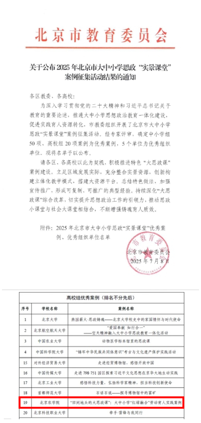 近日,北京市教育委員會、北京市高等教育學(xué)會先后公布了2025年北京市大中小學(xué)思政“實景課堂”案例征集活動評選結(jié)果、2025年教育教學(xué)改革示范案例評選活動評選結(jié)果,我校報送的《“田間地頭的大思政課”:大中小學(xué)“紅綠融合”勞動育人實踐案例》和《“紅+綠”的實證課堂:農(nóng)林院校<習(xí)近平新時代中國特色社會主義思想概論>教學(xué)改革創(chuàng)新》案例在眾多高校中脫穎而出,分別榮獲北京市大中小學(xué)思政“實景課堂”優(yōu)秀案例和教育教學(xué)改革示范案例。