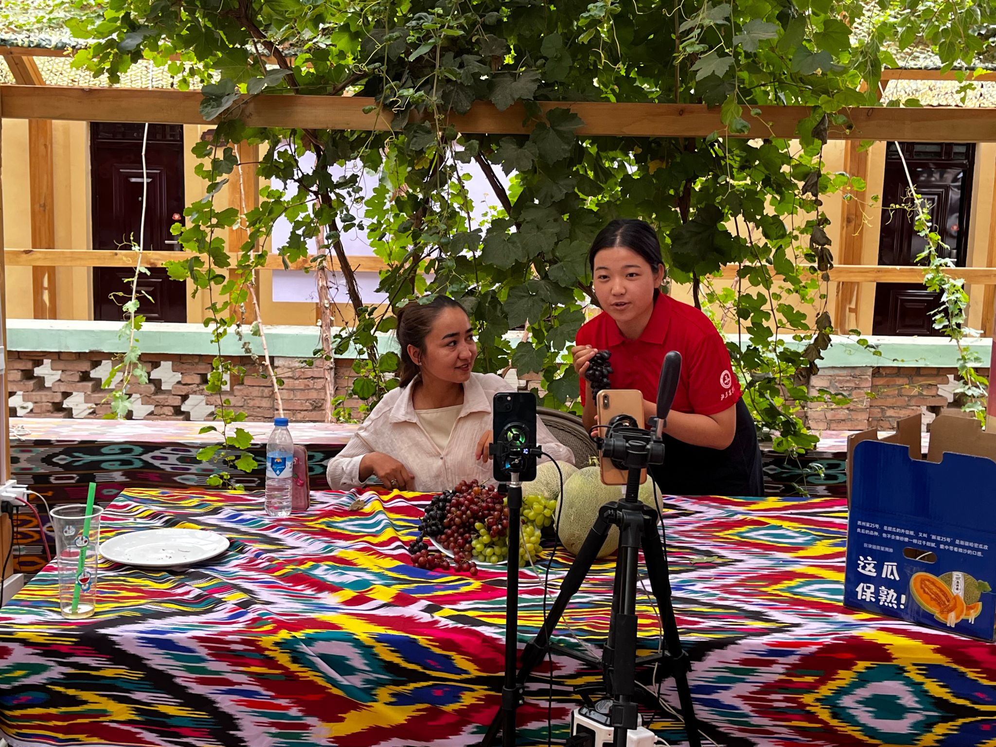 葡萄產業(yè)是吐魯番地區(qū)的富民產業(yè),是鄉(xiāng)親們口中的“甜蜜事業(yè)”,是當地推動文化和旅游深度融合的紐帶和“金名片”。實踐團參與到2023年吐魯番葡萄采摘季開園儀式中,幫助當地果農組織葡萄采摘派對、搭建舞臺、布置場地、向游客介紹葡萄品種。實踐團成員還走進葡萄售賣直播間化身“帶貨主播”,以實際行動助力村民增收和葡萄產業(yè)發(fā)展。
