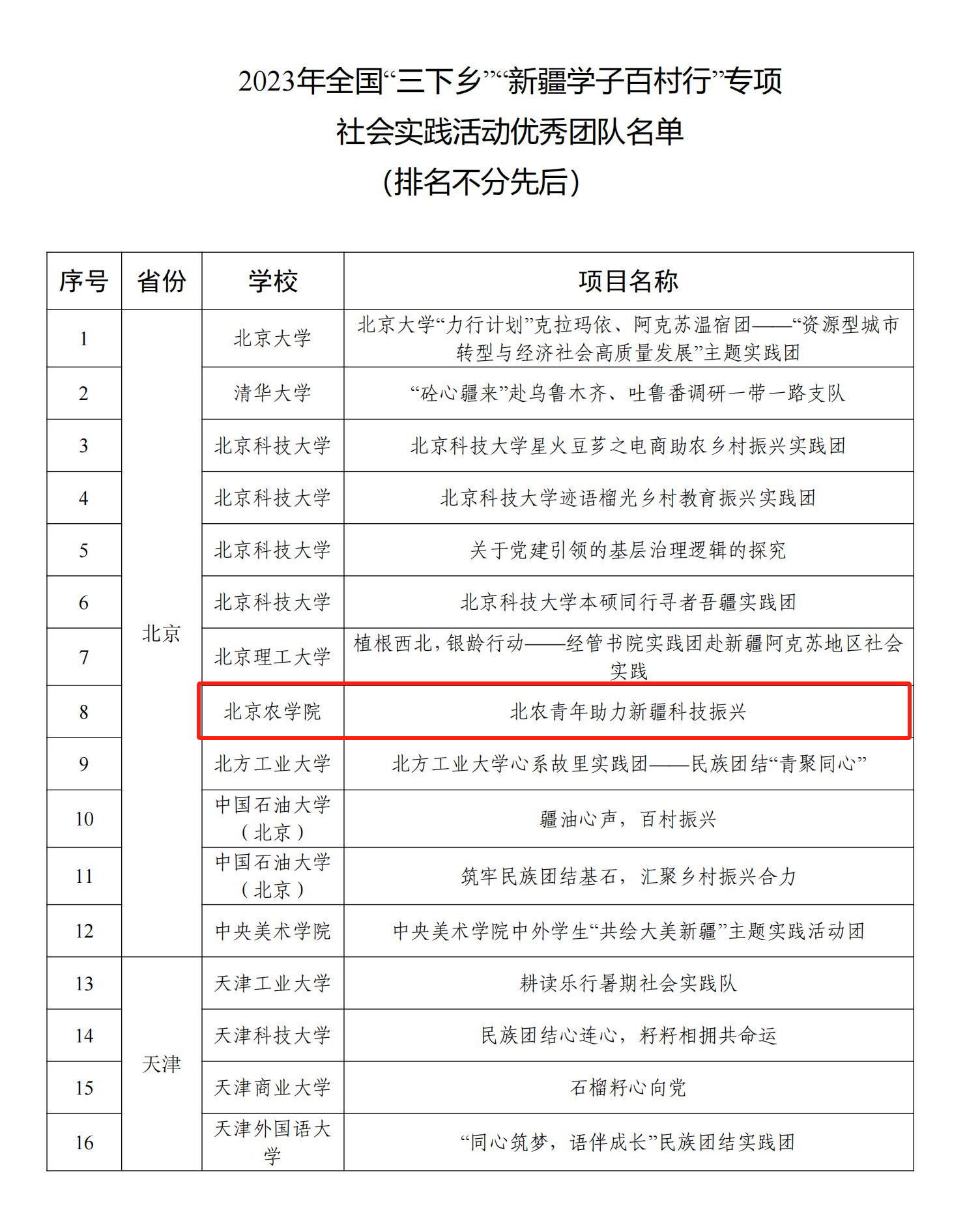 11月1日,共青團新疆維吾爾自治區(qū)委公布了2023年全國“三下鄉(xiāng)”“新疆學子百村行”專項社會實踐活動優(yōu)秀團隊名單,我校生物與資源環(huán)境學院“北農青年助力新疆科技振興”實踐團從全國127所高校的230支隊伍中脫穎而出,獲評優(yōu)秀團隊。