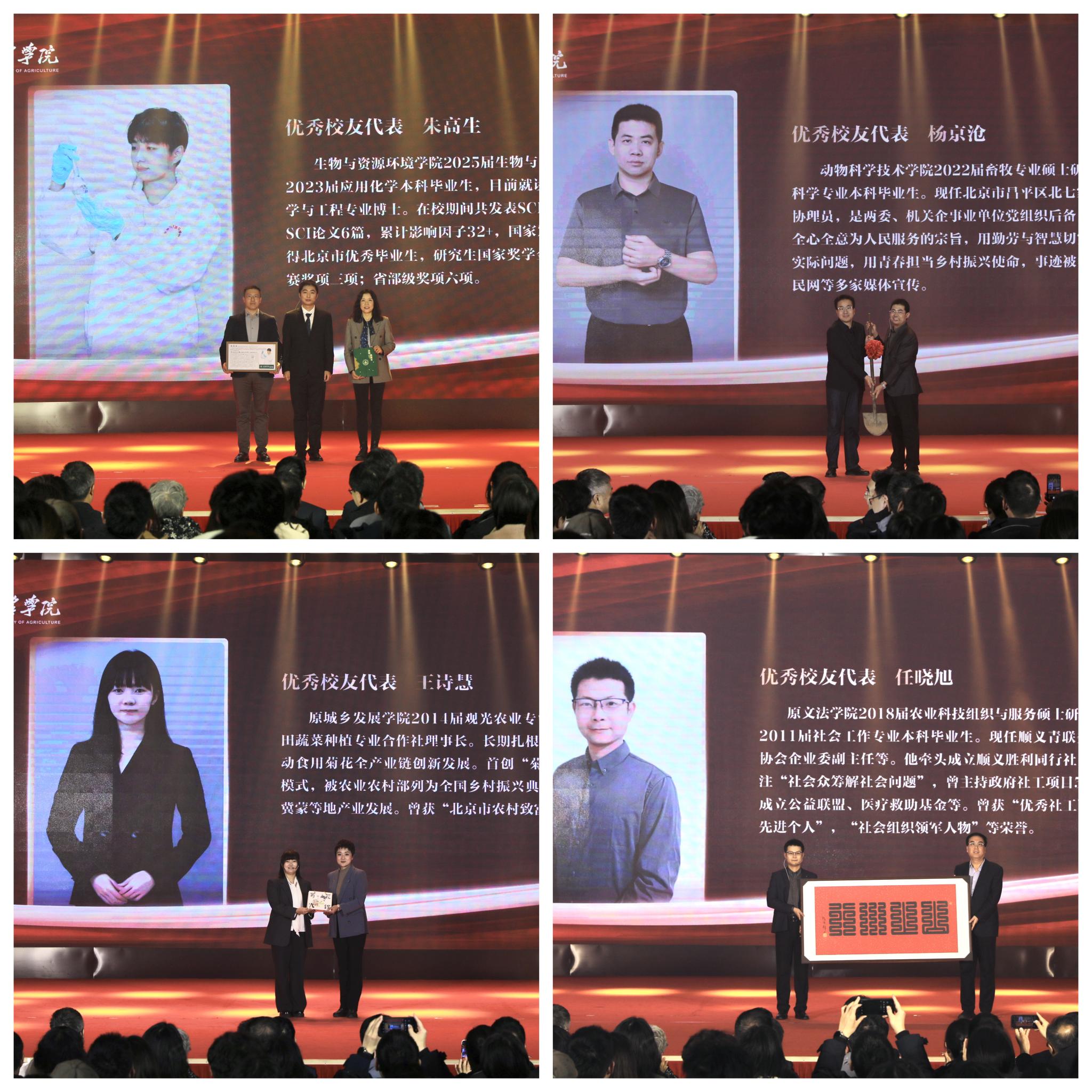 優(yōu)秀畢業(yè)生代表朱高生、楊京滄、王詩慧、任曉旭分享了在學(xué)校學(xué)習(xí)和成長的難忘經(jīng)歷,講述了畢業(yè)后持續(xù)深耕科研以及服務(wù)鄉(xiāng)村振興的奮斗故事,為同學(xué)們送上青春寄語,向母校贈(zèng)送蘊(yùn)含著拼搏與汗水的珍貴禮物,感謝母校及老師們的關(guān)懷和培養(yǎng)。