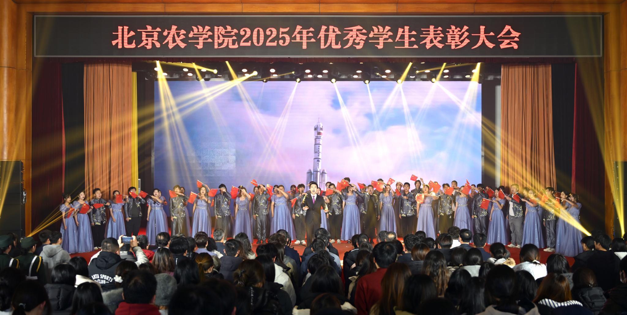表彰大會(huì)在大學(xué)生合唱團(tuán)《領(lǐng)航》《歌唱祖國》合唱聲中落下帷幕。