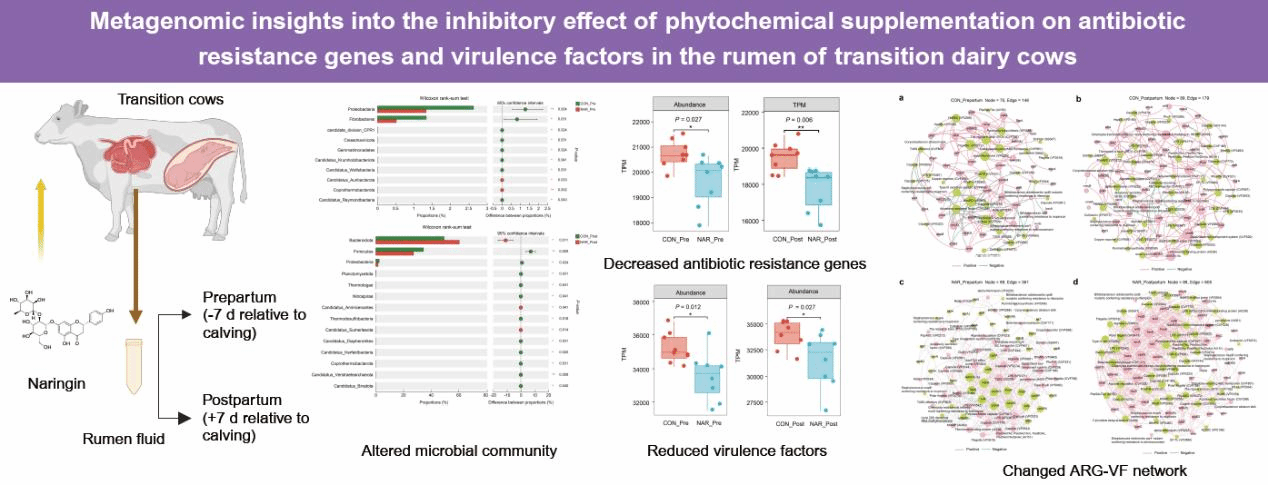 據(jù)悉,抗生素耐藥性被世界衛(wèi)生組織列為全球十大公共衛(wèi)生威脅之一。畜牧業(yè)中抗生素的廣泛使用導(dǎo)致動(dòng)物腸道成為抗性基因的“儲(chǔ)存庫”,這些基因可能通過糞便、唾液或畜產(chǎn)品鏈條傳播至環(huán)境。此外,細(xì)菌采用毒力策略來逃避宿主防御,抗生素耐藥菌株通常攜帶毒力因子,抗性基因和毒力因子的同時(shí)存在通過增加了細(xì)菌的適應(yīng)性、持久性和傳播潛力加劇了人類健康的風(fēng)險(xiǎn)。研究表明,奶牛作為反芻動(dòng)物,其瘤胃微生物群是抗性基因和毒力因子的重要載體,尤其在圍產(chǎn)期(產(chǎn)前3周—產(chǎn)后3周階段),奶牛生理代謝劇烈變化可能加劇抗性基因的擴(kuò)散。尋找天然干預(yù)手段抑制抗性基因和毒力因子的傳播,已成為農(nóng)業(yè)與環(huán)境科學(xué)領(lǐng)域的重要課題。