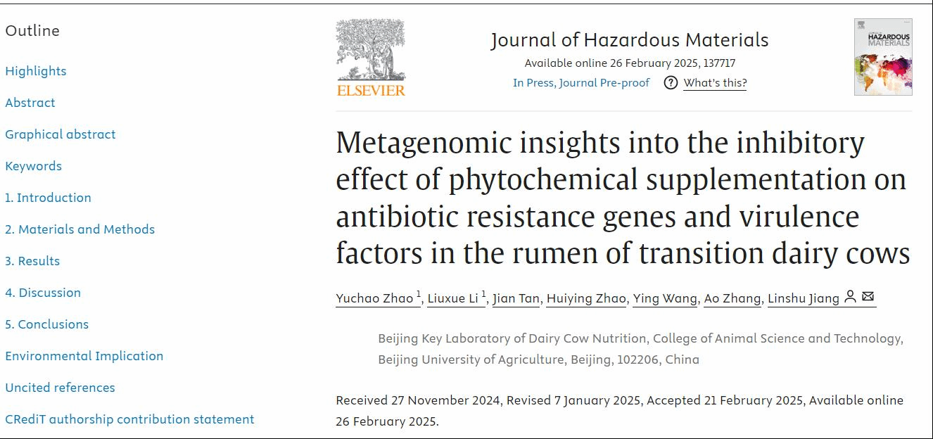 近日,我校蔣林樹教授團(tuán)隊(duì)在國際學(xué)術(shù)期刊《危險(xiǎn)材料雜志》(Journal of Hazardous Materials,中科院1區(qū)Top期刊,影響因子12.2)在線發(fā)表了題為《植物活性物質(zhì)添加劑對(duì)圍產(chǎn)期奶牛瘤胃抗生素抗性基因和毒力因子抑制作用的宏基因組學(xué)研究》(Metagenomic insights into the inhibitory effect of phytochemical supplementation on antibiotic resistance genes and virulence factors in the rumen of transition dairy cows)的研究性論文。該研究以圍產(chǎn)期奶牛為研究模型探究了飼糧中添加柚皮苷對(duì)瘤胃抗性基因和毒力因子的影響與機(jī)制,為開發(fā)植物源飼料添加劑改善瘤胃功能、減少抗性基因和毒力因子向環(huán)境的擴(kuò)散提供了理論基礎(chǔ)。動(dòng)物科學(xué)技術(shù)學(xué)院趙玉超副教授和已畢業(yè)研究生李留學(xué)(現(xiàn)為南京農(nóng)業(yè)大學(xué)博士研究生)為論文的共同第一作者,蔣林樹為論文的通訊作者。該研究獲得了國家自然科學(xué)基金項(xiàng)目和北京市自然科學(xué)基金的資助。