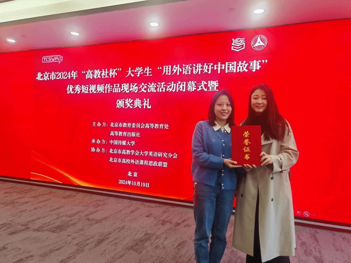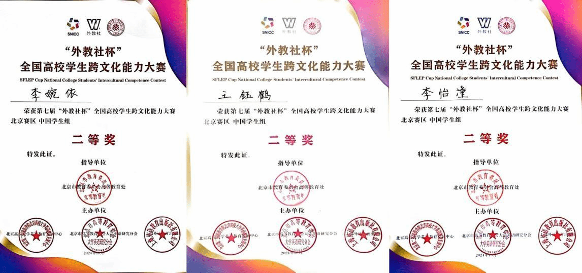 近日,我校學生在第七屆“外教社杯”全國高校學生跨文化能力大賽(北京賽區(qū))、第三屆“外教社杯”北京高校青年人才國際勝任力大賽、北京市2024年“高教社杯”大學生“用外語講好中國故事”優(yōu)秀短視頻作品征集活動中喜獲佳績。