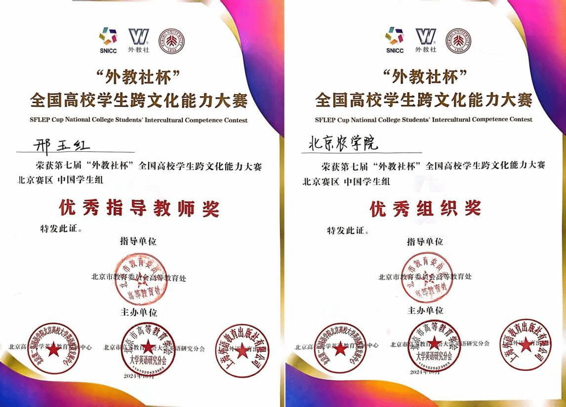 第七屆“外教社杯”全國高校學生跨文化能力大賽(北京賽區(qū))決賽在北京大學舉行。我校文法與城鄉(xiāng)發(fā)展學院王鈺鶴、國際學院李婉依、李怡潼三位同學組成的跨文化競賽團隊,斬獲北京賽區(qū)二等獎,取得了我校學生參加此項大賽以來的最好成績。外語教學部邢玉紅老師獲優(yōu)秀指導教師獎,學校榮獲優(yōu)秀組織獎。