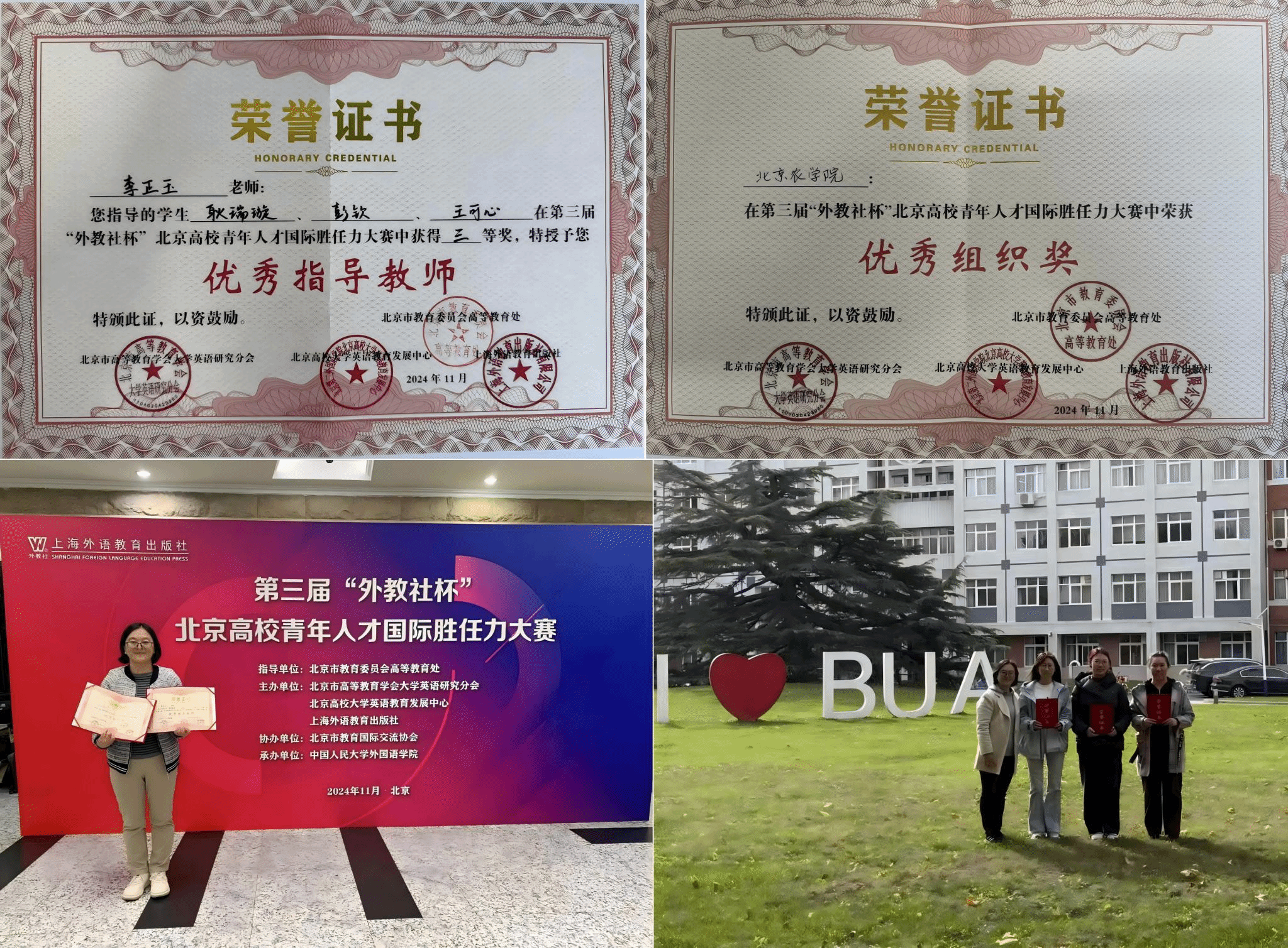 第三屆“外教社杯”北京高校青年人才國際勝任力大賽決賽在中國人民大學舉行。在我校外語教學部李正玉老師的指導下,國際學院王可心、耿瑞璇,經濟管理學院彭欽三位同學在比賽中表現(xiàn)優(yōu)異,榮獲三等獎,學校獲“優(yōu)秀組織獎”。