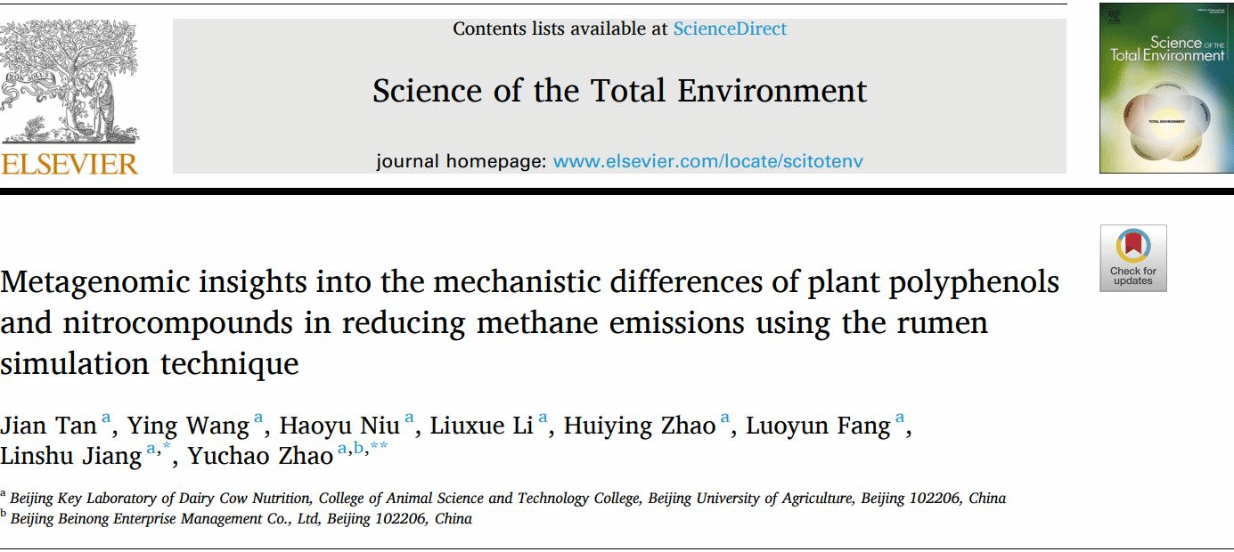 譚健為第一作者、趙玉超與蔣林樹為共同通訊作者發表的另一篇關于植物多酚和硝基化合物在減少反芻動物甲烷排放中作用機制的論文為《Metagenomic insights into the mechanistic differences of plant polyphenols and nitrocompounds in reducing methane emissions using the rumen simulation technique》。該研究利用體外模擬瘤胃發酵技術,從微生物組學角度揭示了不同添加劑在降低瘤胃甲烷排放中的具體作用路徑,為畜牧業綠色生產提供了科學依據。