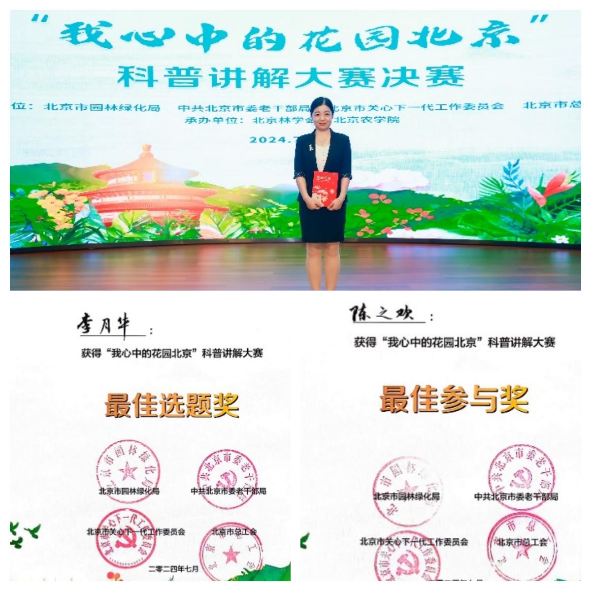 經(jīng)過激烈角逐,我校園林學(xué)院多位師生獲獎(jiǎng)。其中,馮麗副教授獲得非專職組三等獎(jiǎng),李月華老師獲得最佳選題獎(jiǎng)、最佳參與獎(jiǎng),退休教師陳之歡獲得最佳參與獎(jiǎng),張慧穎同學(xué)進(jìn)入復(fù)賽。我校師生在比賽中展現(xiàn)出較高的專業(yè)素養(yǎng),為傳播園林科學(xué)與文化知識,宣傳北京花園城市建設(shè)作出積極貢獻(xiàn)。