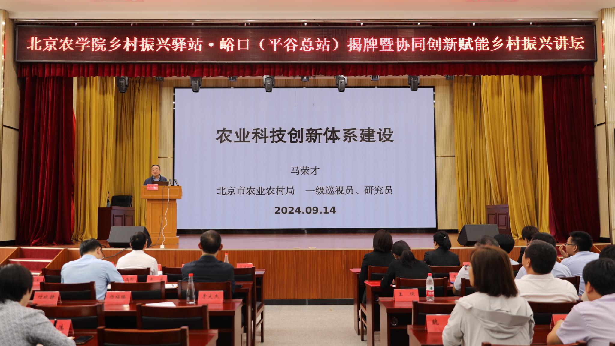 近日,北京農學院鄉村振興驛站揭牌儀式暨協同創新賦能鄉村振興講壇在平谷區峪口鎮舉行。北京市農業農村局一級巡視員馬榮才,學校黨委副書記、院長段留生,平谷區委副書記葛海斌,平谷區副區長李子騰出席活動。
