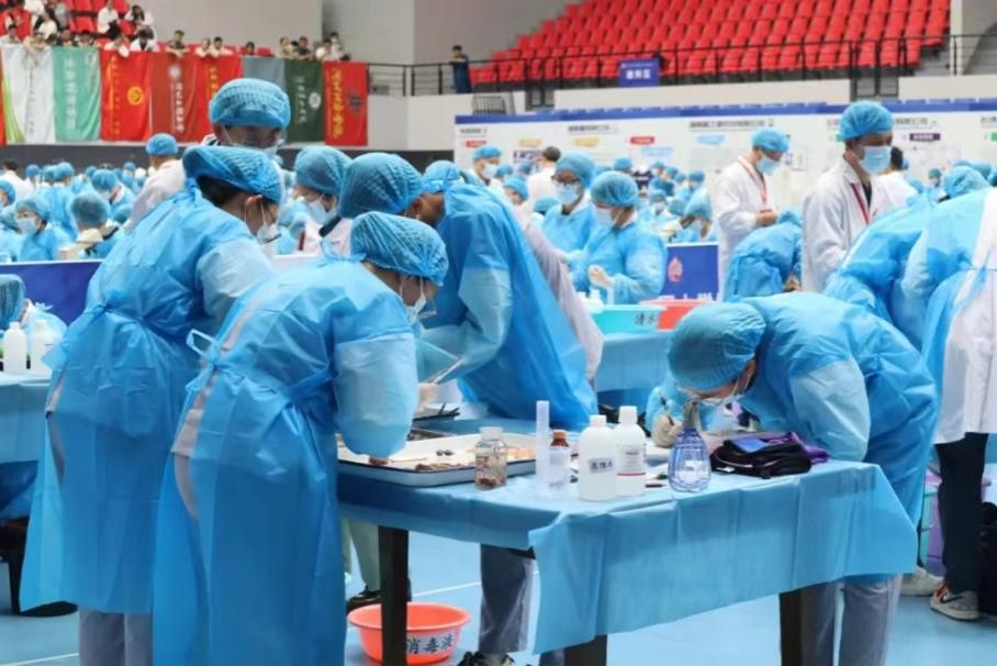 本屆比賽分為山羊瘤胃切開術(shù)、病原菌檢查與血凝試驗、禽的病理剖檢三個部分。成績評定標(biāo)準(zhǔn)以參賽隊伍現(xiàn)場操作的規(guī)范性、熟練程度和配合情況等進(jìn)行綜合考量,82名裁判打分按比例折算團隊得分。我校代表隊成員柏良庸、劉瑩、王方、梁雪菲、馬子禾在指導(dǎo)老師張建軍、張華、周雙海、張永紅的示范和指導(dǎo)下,熟練、高質(zhì)量地完成系列操作,充分展示了動醫(yī)專業(yè)學(xué)生扎實的實操技能和較高的專業(yè)素養(yǎng)。