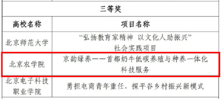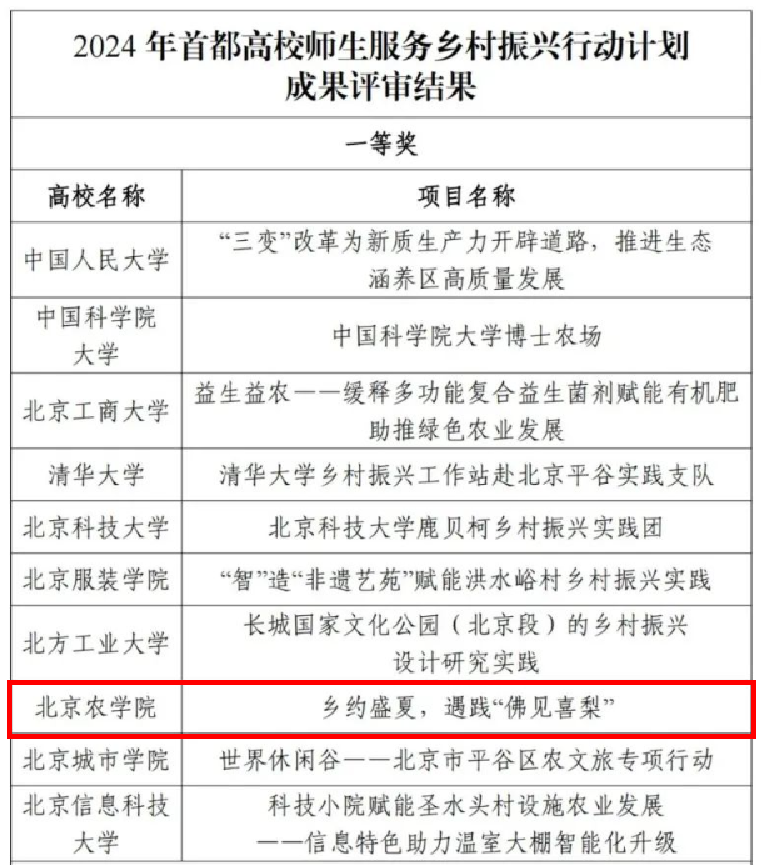 日前,由北京市委教育工委、市教委組織的2024年首都高校師生服務鄉(xiāng)村振興行動計劃成果評審結(jié)果正式公布,共評選出一等獎10項、二等獎20項、三等獎30項、優(yōu)秀獎39項。我校生物與資源環(huán)境學院“鄉(xiāng)約盛夏,遇踐‘佛見喜梨’”團隊榮獲一等獎,食品科學與工程學院“‘麥’香禮賢——一‘麥’相承助鄉(xiāng)村”團隊榮獲二等獎,動物科學技術(shù)學院“京韻綠養(yǎng)——首都奶牛低碳養(yǎng)殖與種養(yǎng)一體化科技服務”團隊榮獲三等獎。