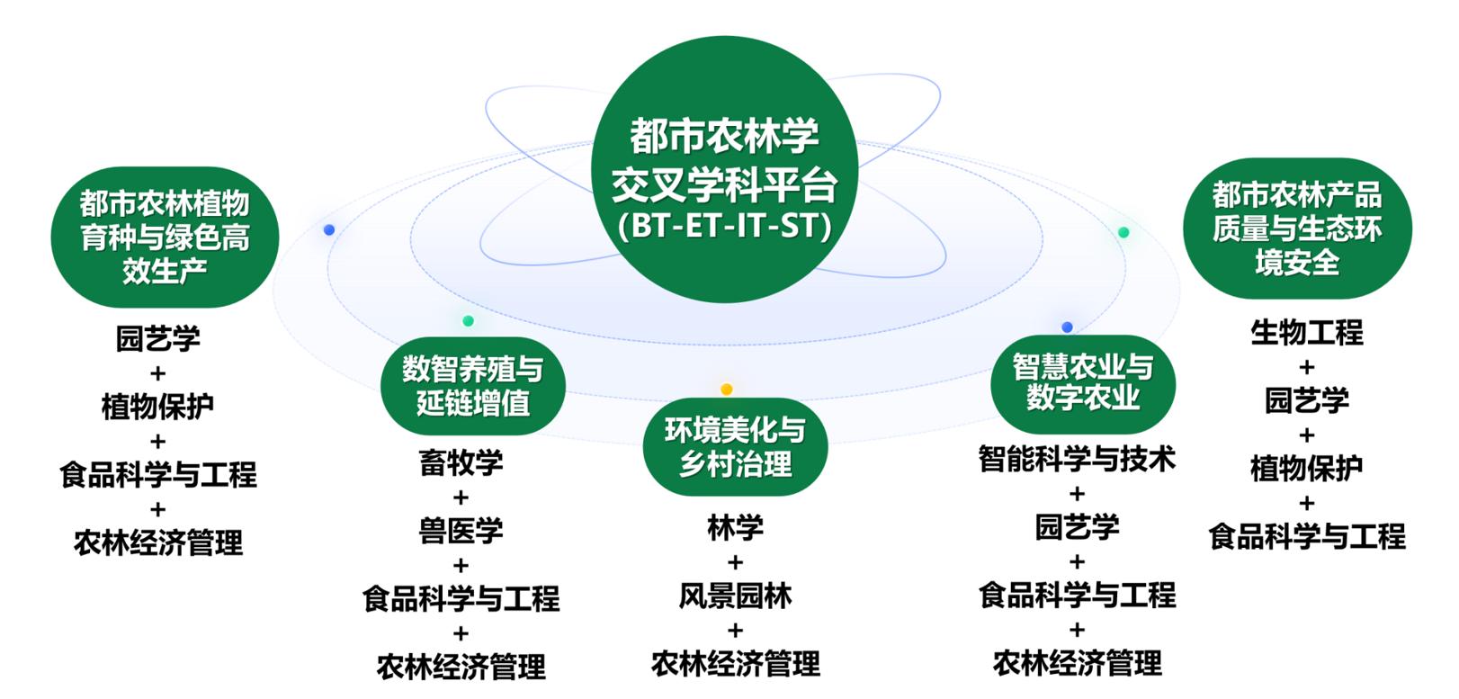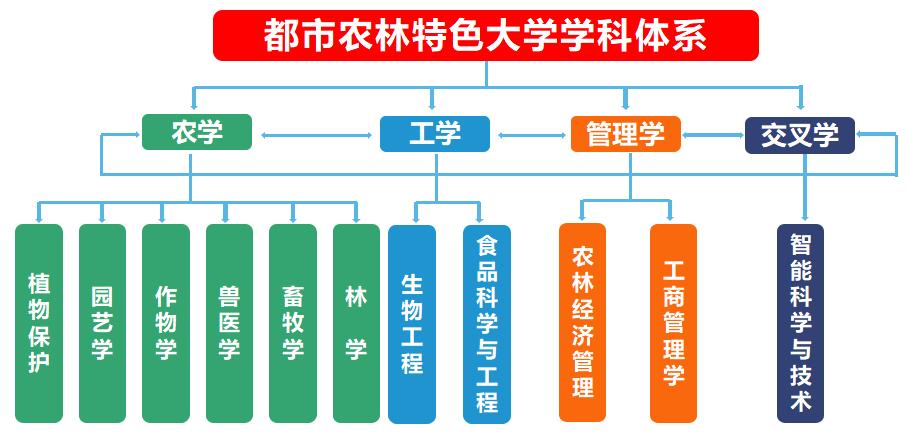 學校現有生物工程、植物保護、園藝學、作物學、畜牧學、獸醫學、農林經濟管理、工商管理學、林學、食品科學與工程、智能科學與技術11個一級學科;有生物與醫藥碩士、獸醫碩士、國際商務碩士、風景園林碩士、林業碩士、社會工作碩士、農業碩士7個專業學位類別13個招生領域。“十四五”時期,形成以農科為特色,農學、工學、管理學、交叉學協同發展的多元化都市農林特色學科體系。
