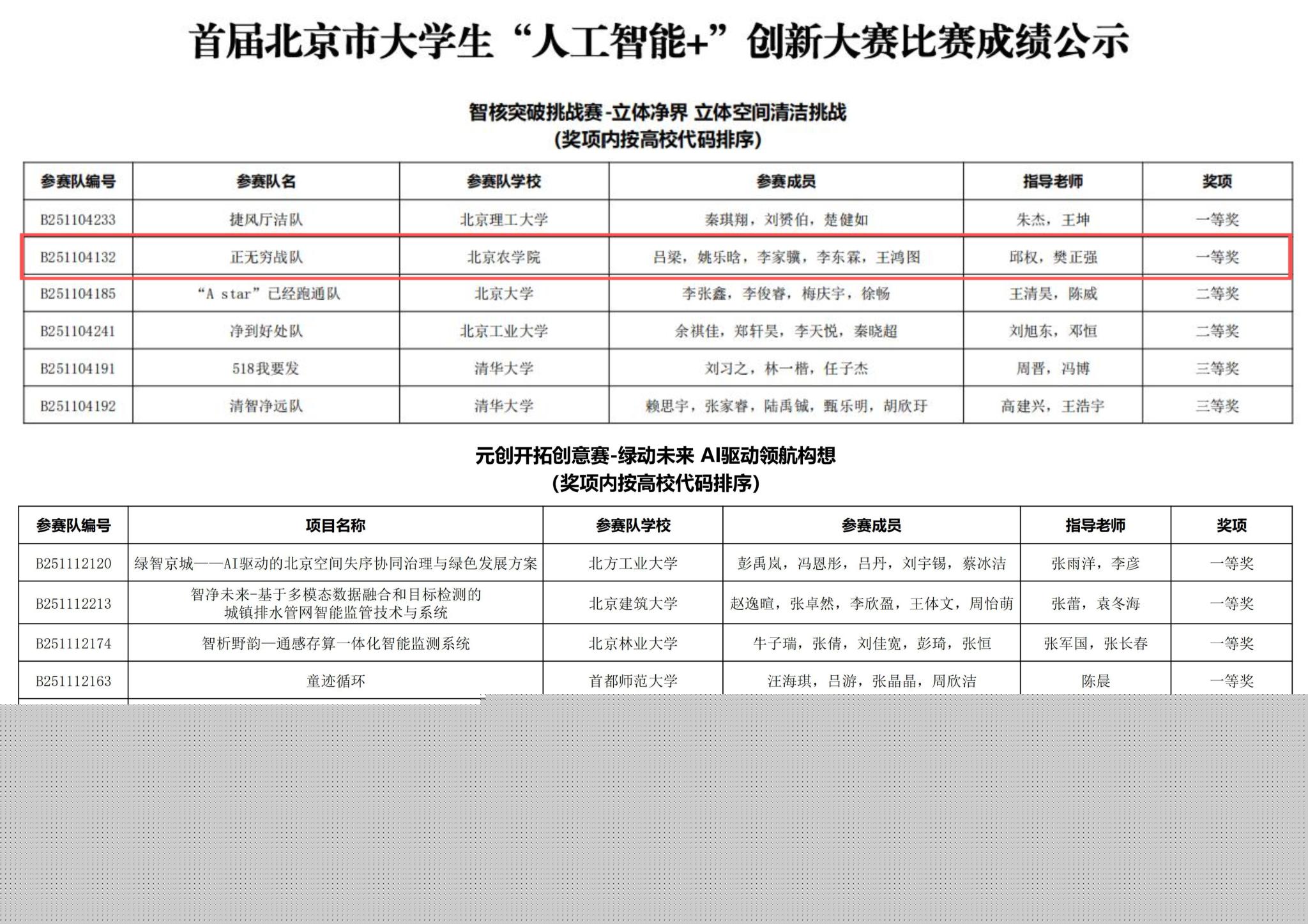 近日,由北京市教委主辦的首屆北京市大學生“人工智能+”創新大賽在北京工業大學落幕。我校智能科學與工程學院呂梁、姚樂晗、李家驥、李東霖、王鴻圖5名同學組成的“正無窮戰隊”,在邱權、樊正強兩位老師指導下,斬獲“智核突破挑戰賽”一等獎。生物與資源環境學院藍紹展、陳輝、李璐羽、許振航、張卓鑫5名同學在于寶義、梁丹兩位老師的指導下,憑借“‘晶’益‘囚’精--AI賦能農藥綠色可持續發展”項目榮獲“元創開拓創意賽”二等獎。