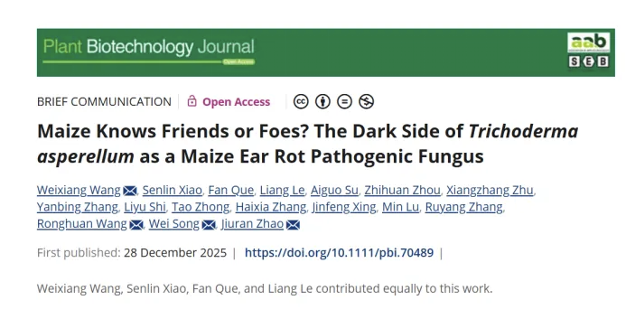 近日,我校植物科學技術學院王維香教授團隊聯合北京市農林科學院趙久然研究員團隊在國際知名學術期刊《Plant Biotechnology Journal》在線發表了題為“Maize Knows Friends or Foes?The Dark Side ofTrichoderma asperellumas a Maize Ear Rot Pathogenic Fungus”(玉米能辨識敵友嗎?棘孢木霉作為玉米穗腐病致病真菌的暗面)的研究成果。該研究首次發現并證實棘孢木霉(T. asperellum)是引發玉米青綠色穗腐病的新型致病真菌,這一突破性發現為生防菌菌劑的應用敲響了警鐘,也為全球玉米產業的健康發展提供了關鍵理論支撐。
