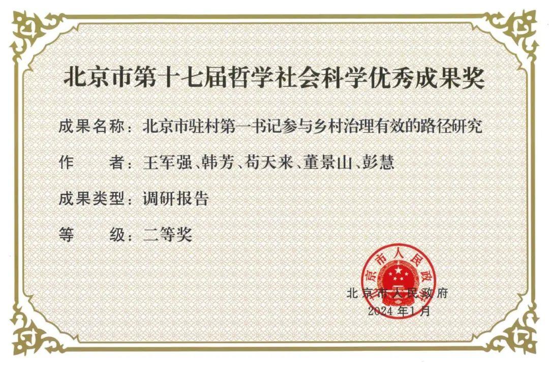 近日,北京市第十七屆哲學社會科學優秀成果獎評選結果正式公布,我校文法與城鄉發展學院王軍強副教授團隊撰寫的調研報告《北京市駐村第一書記參與鄉村治理有效的路徑研究》榮獲二等獎。